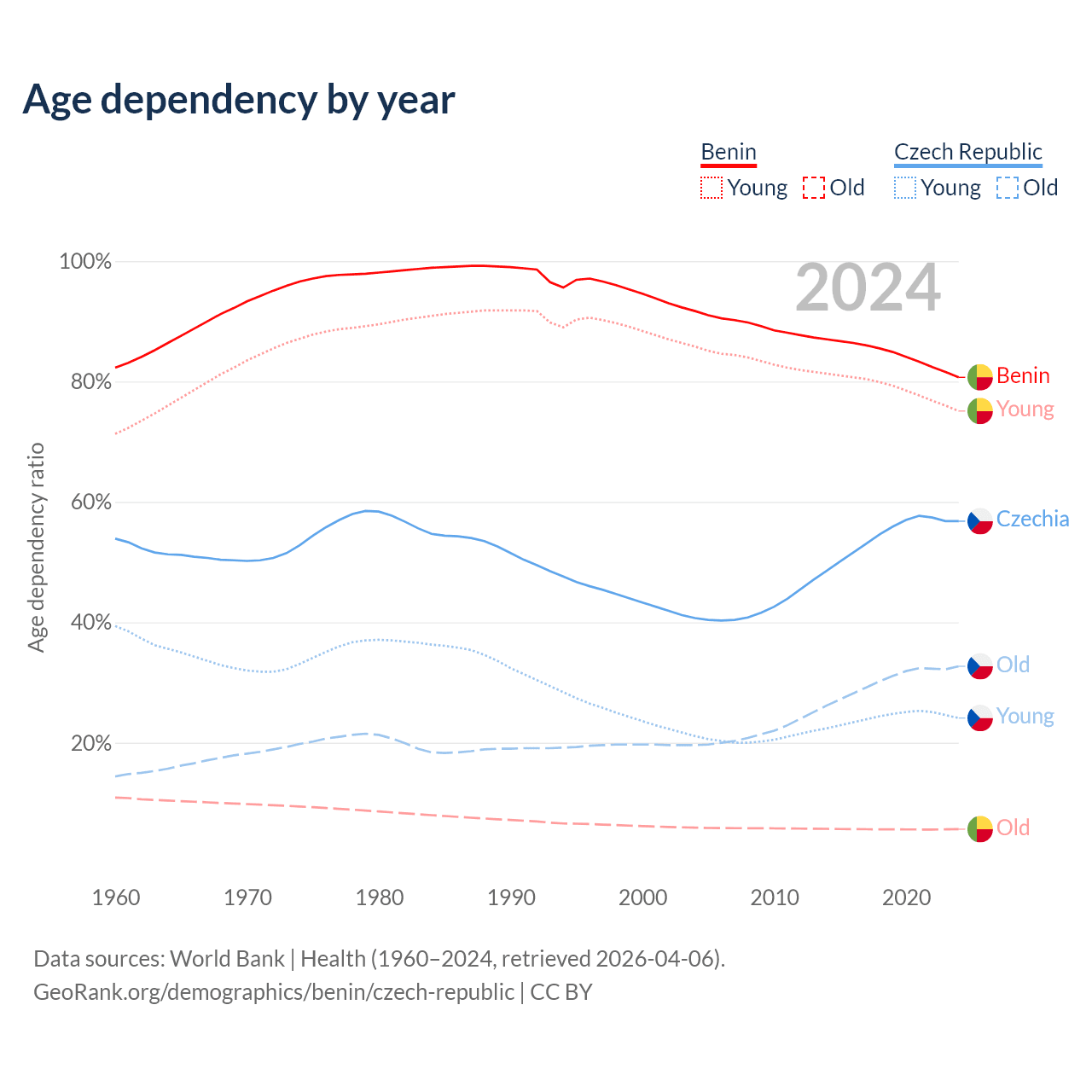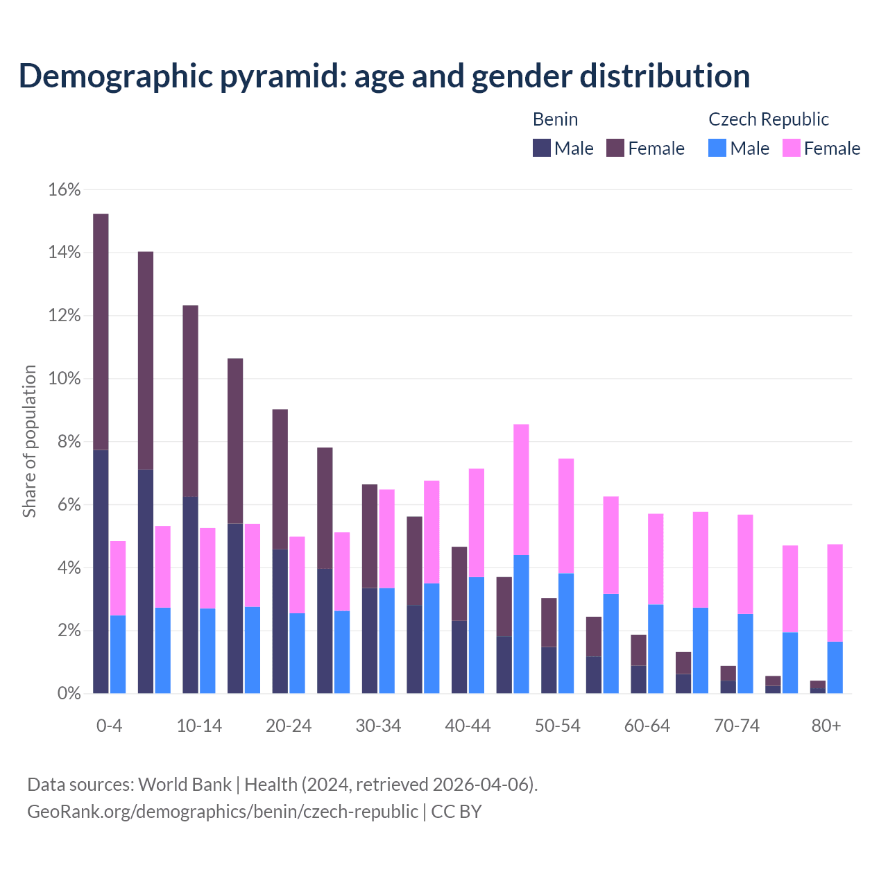 - The share of old-age demographic (65+) in Benin is 3.12% vs 20.8% in the Czech Republic.