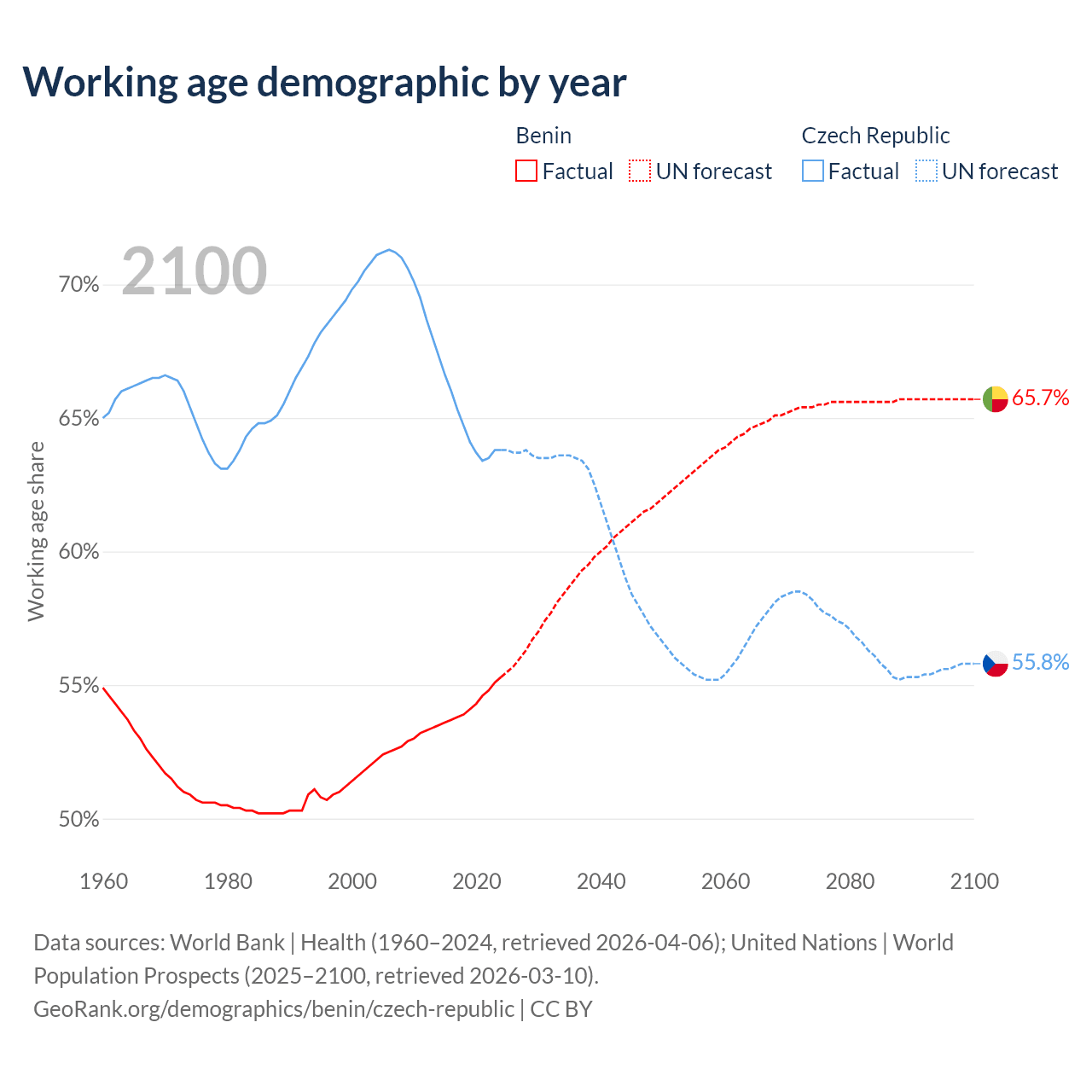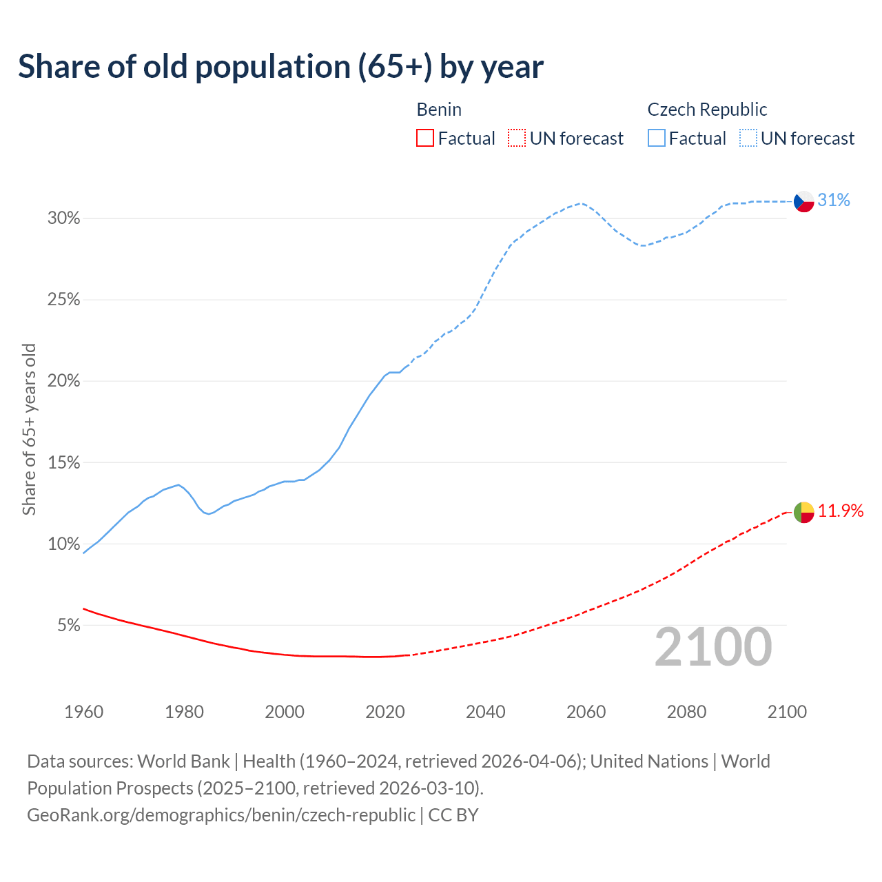 The share of older people aged 65 and over is 3.12% in Benin and 20.8% in the Czech Republic. Life expectancy in Benin compared to the Czech Republic .