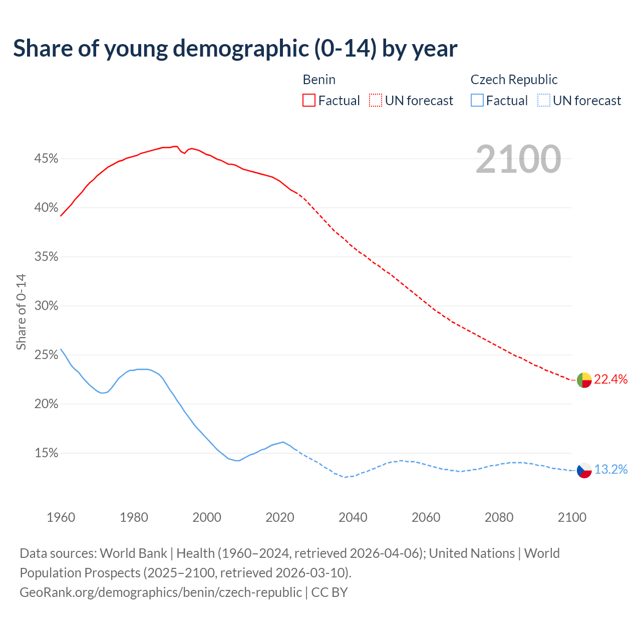 - The share of young demographic (0-15 years old) in Benin is 41.6% vs 15.4% in the Czech Republic.