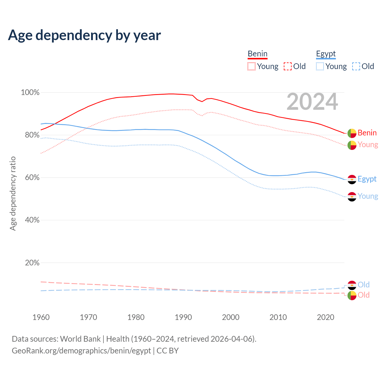 - Benin is ranked 179/196 by median age (oldest to youngest) vs 133/196 for Egypt.