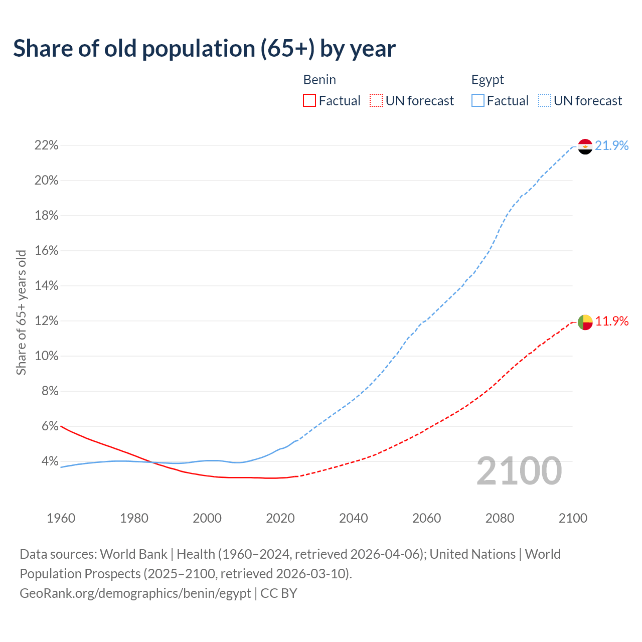The share of older people aged 65 and over is 3.12% in Benin and 5.12% in Egypt. Life expectancy in Benin compared to Egypt .