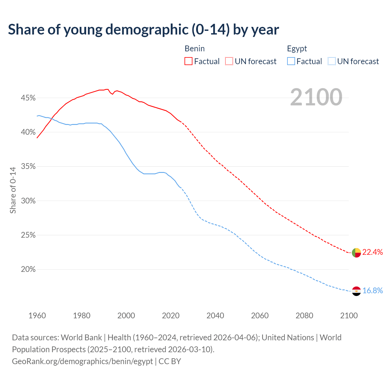 - As of 2026, the population of Benin is 15.3M vs 121M in Egypt - 7.9 times difference.