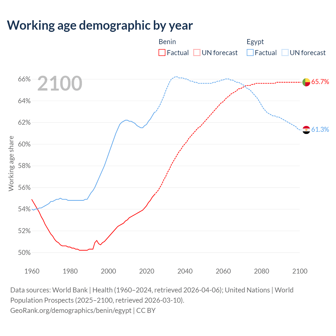 - Benin has 8.45M working age adults (aged 15-64) vs 75.9M in Egypt.
