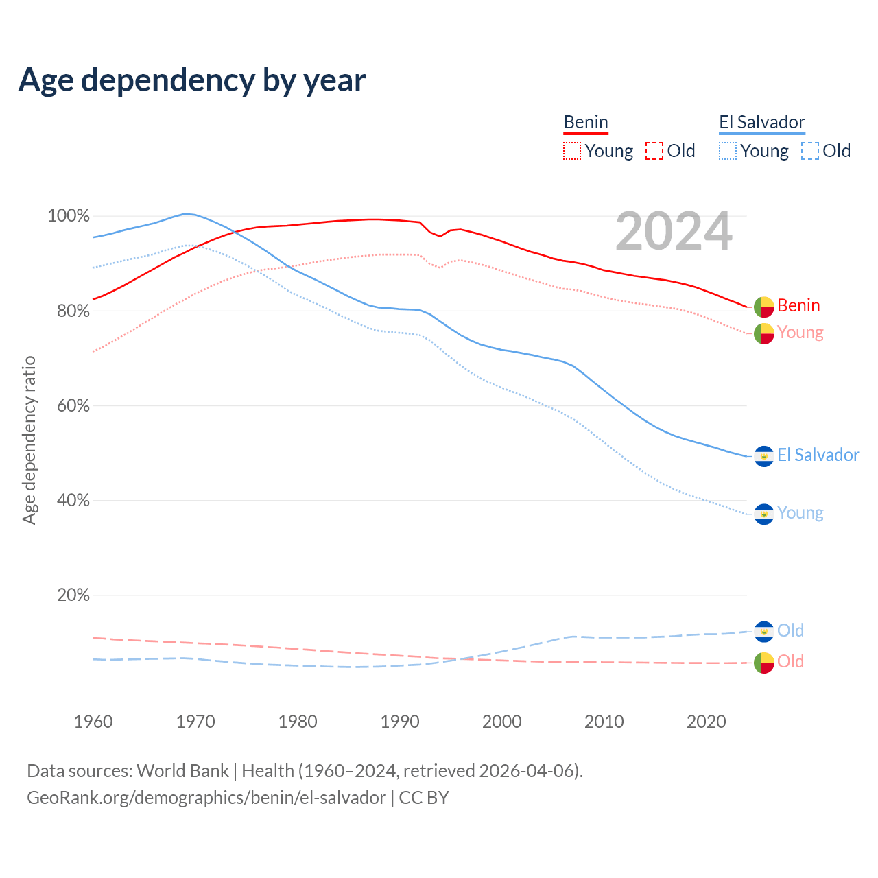 - Benin is ranked 179/196 by median age (oldest to youngest) vs 115/196 for El Salvador.