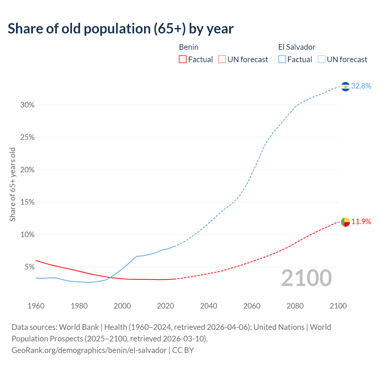 - The share of old-age demographic (65+) in Benin is 3.12% vs 8.15% in El Salvador.