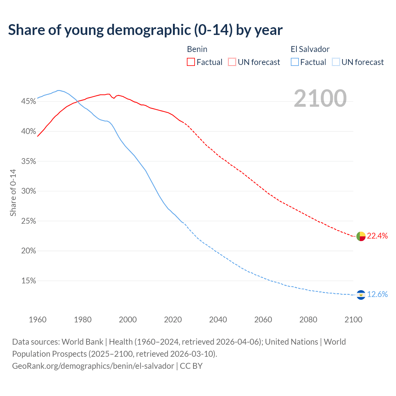 - The share of young demographic (0-15 years old) in Benin is 41.6% vs 24.8% in El Salvador.