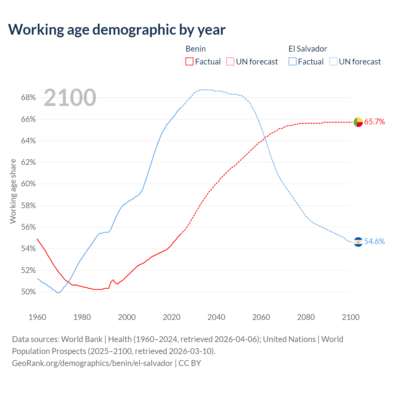 Median age Benin vs El Salvador, 1960-2100