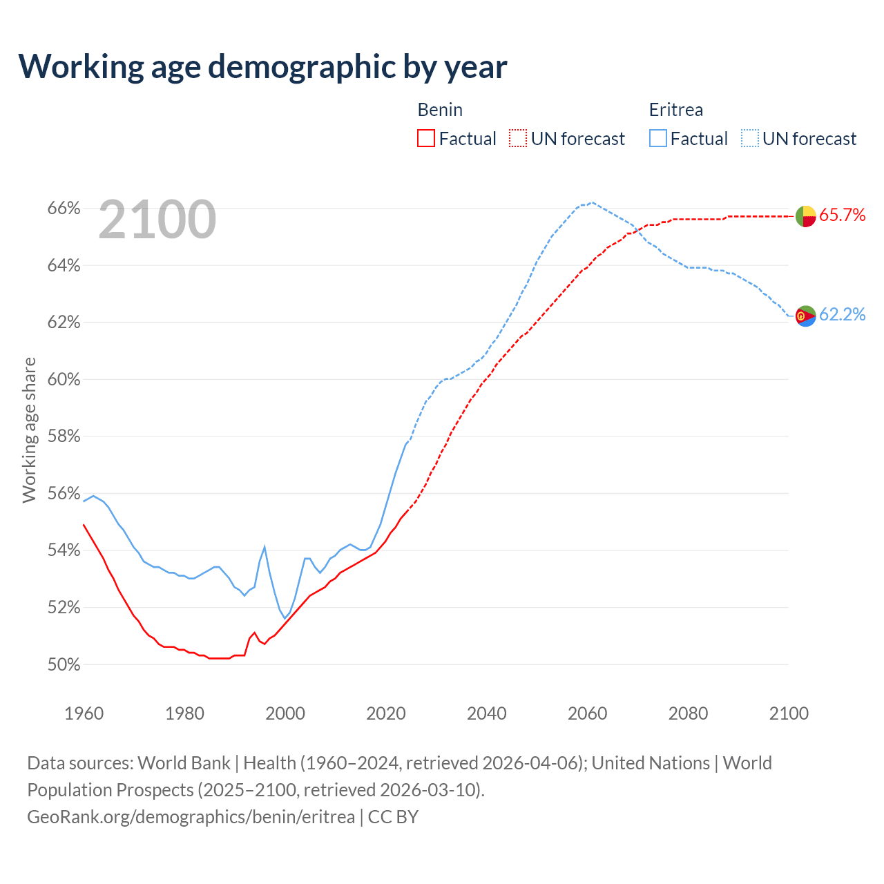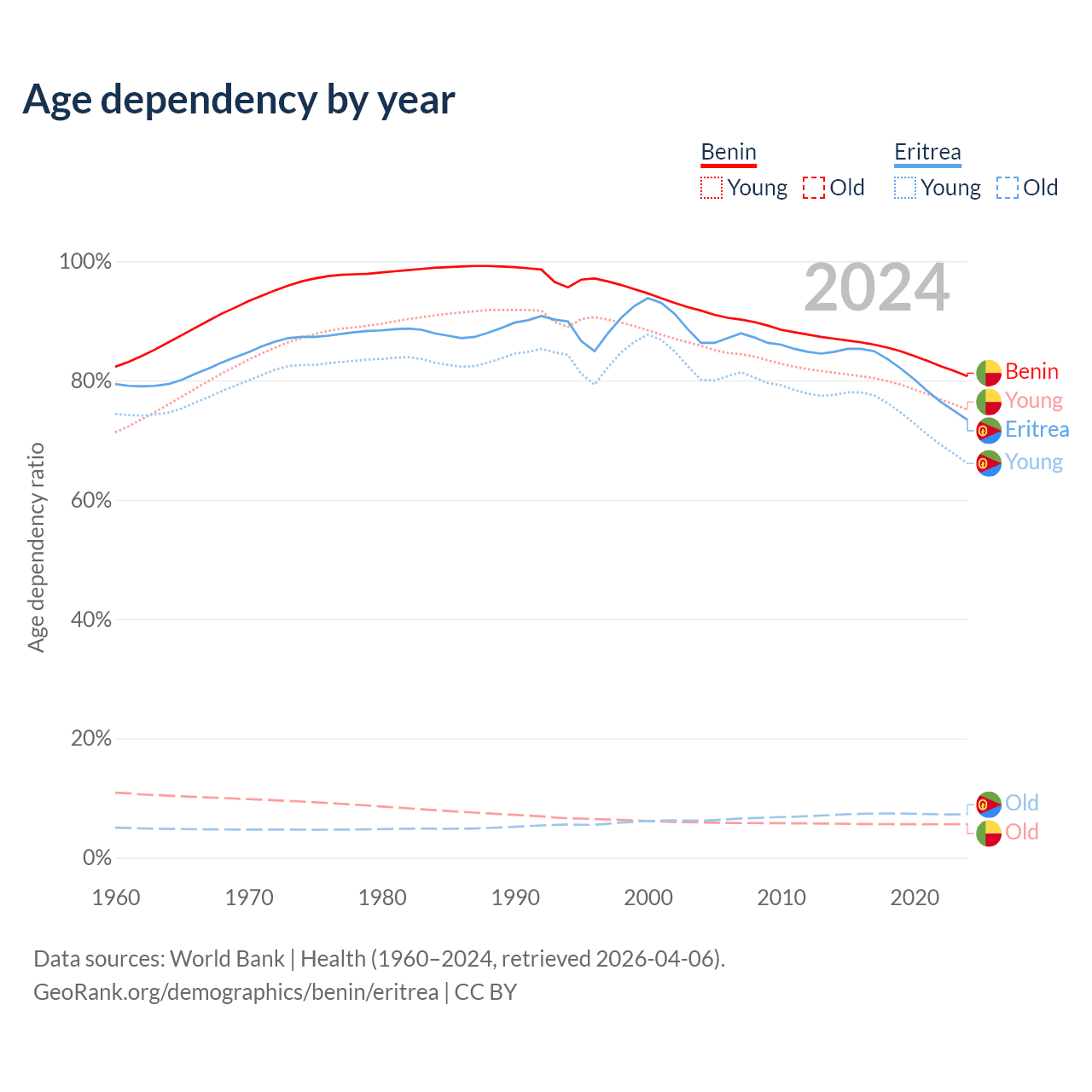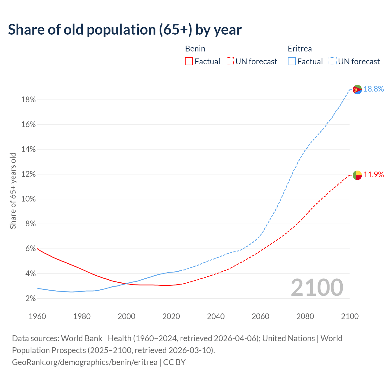 - The share of old-age demographic (65+) in Benin is 3.12% vs 4.2% in Eritrea.