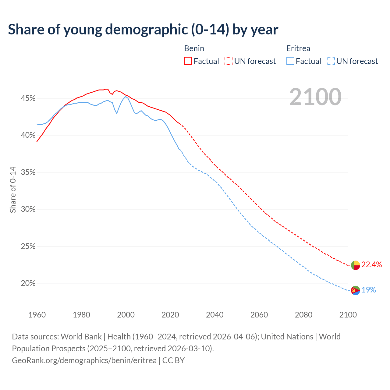 - The share of young demographic (0-15 years old) in Benin is 41.6% vs 38.1% in Eritrea.