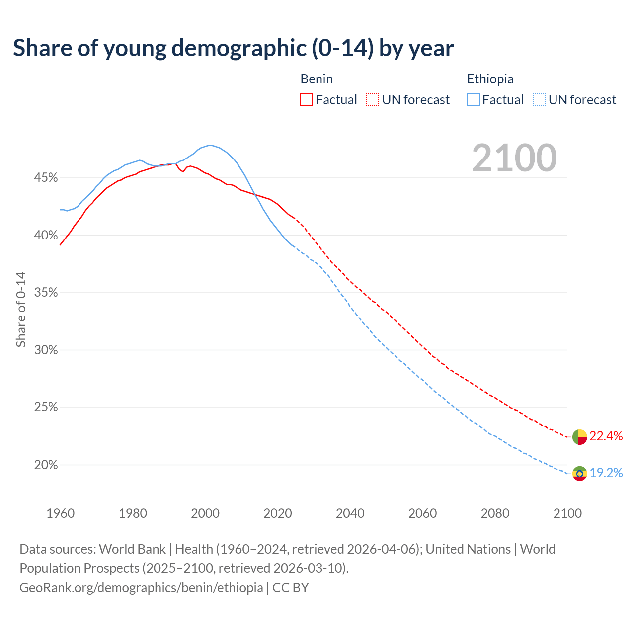 - The share of young demographic (0-15 years old) in Benin is 41.6% vs 39.1% in Ethiopia.