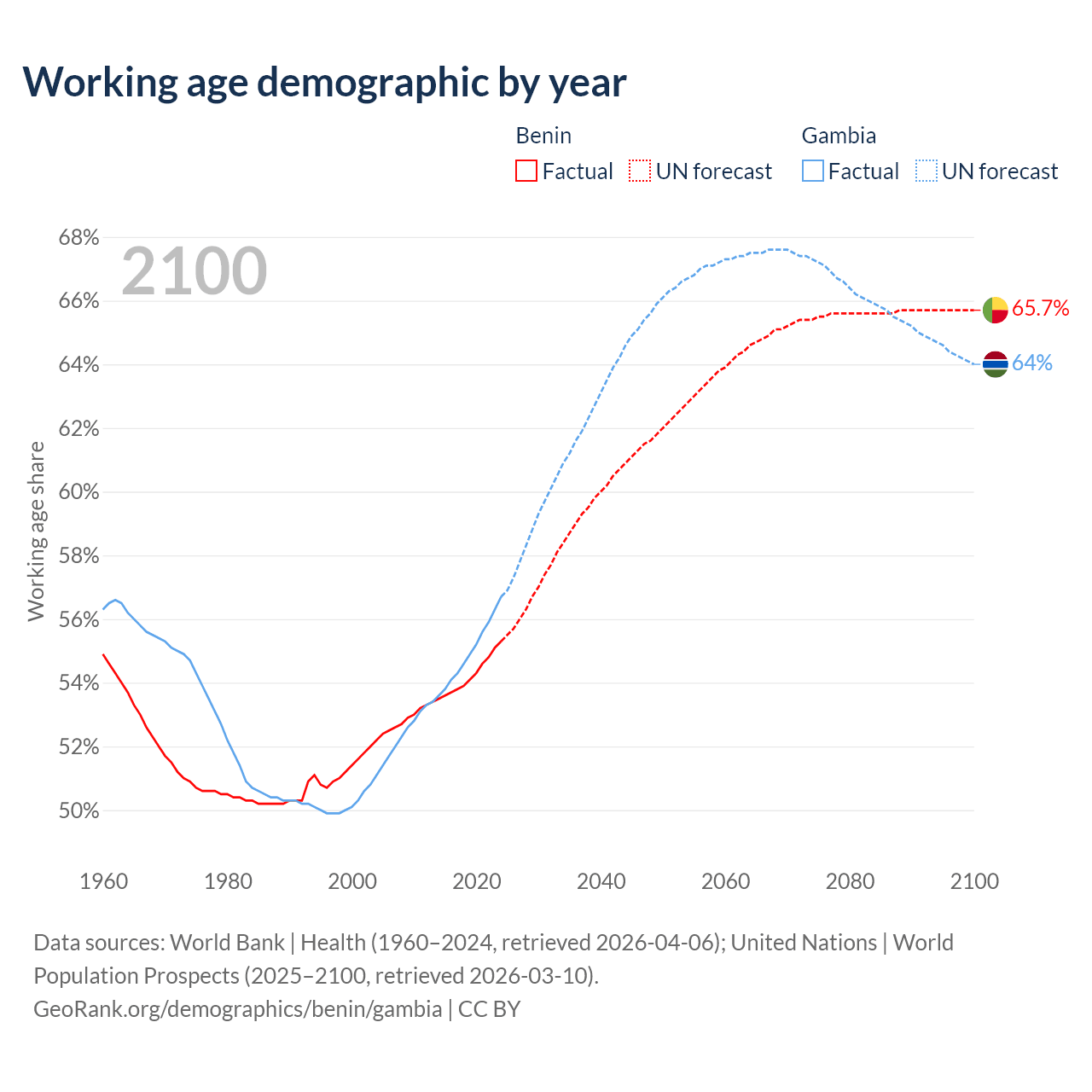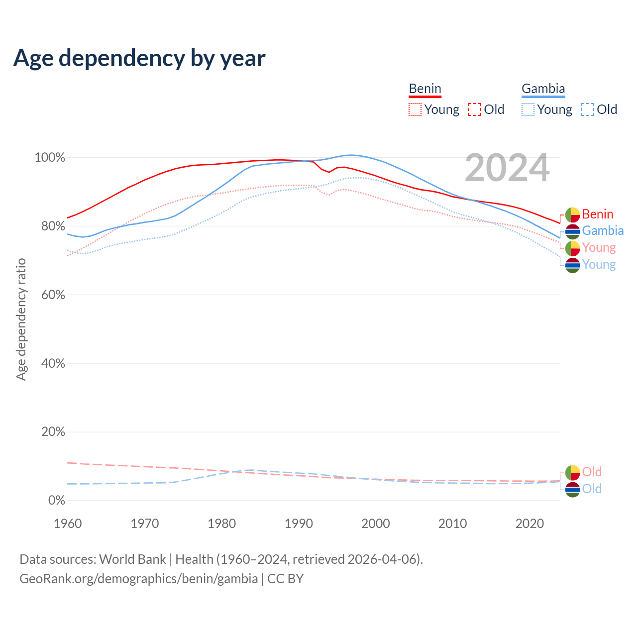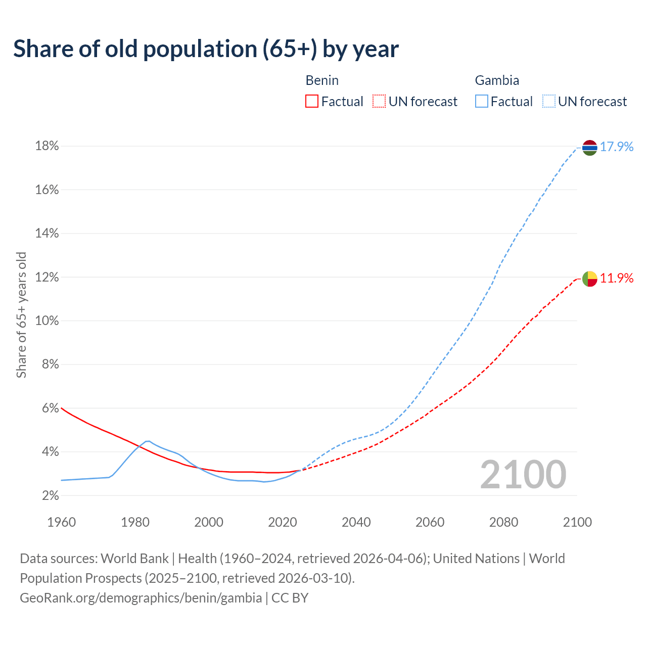 - The share of old-age demographic (65+) in Benin is 3.12% vs 3.08% in the Gambia.