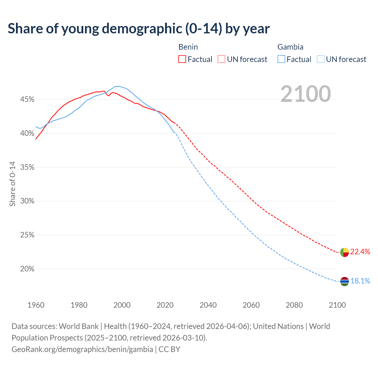 - The share of young demographic (0-15 years old) in Benin is 41.6% vs 40.2% in the Gambia.
