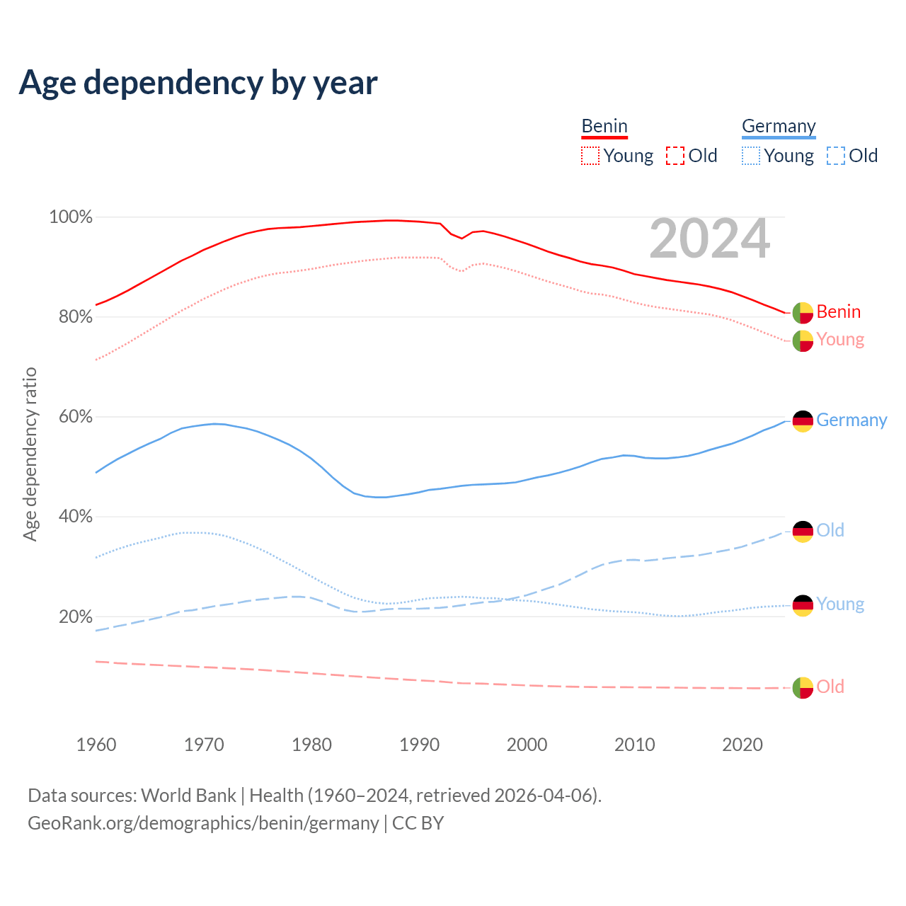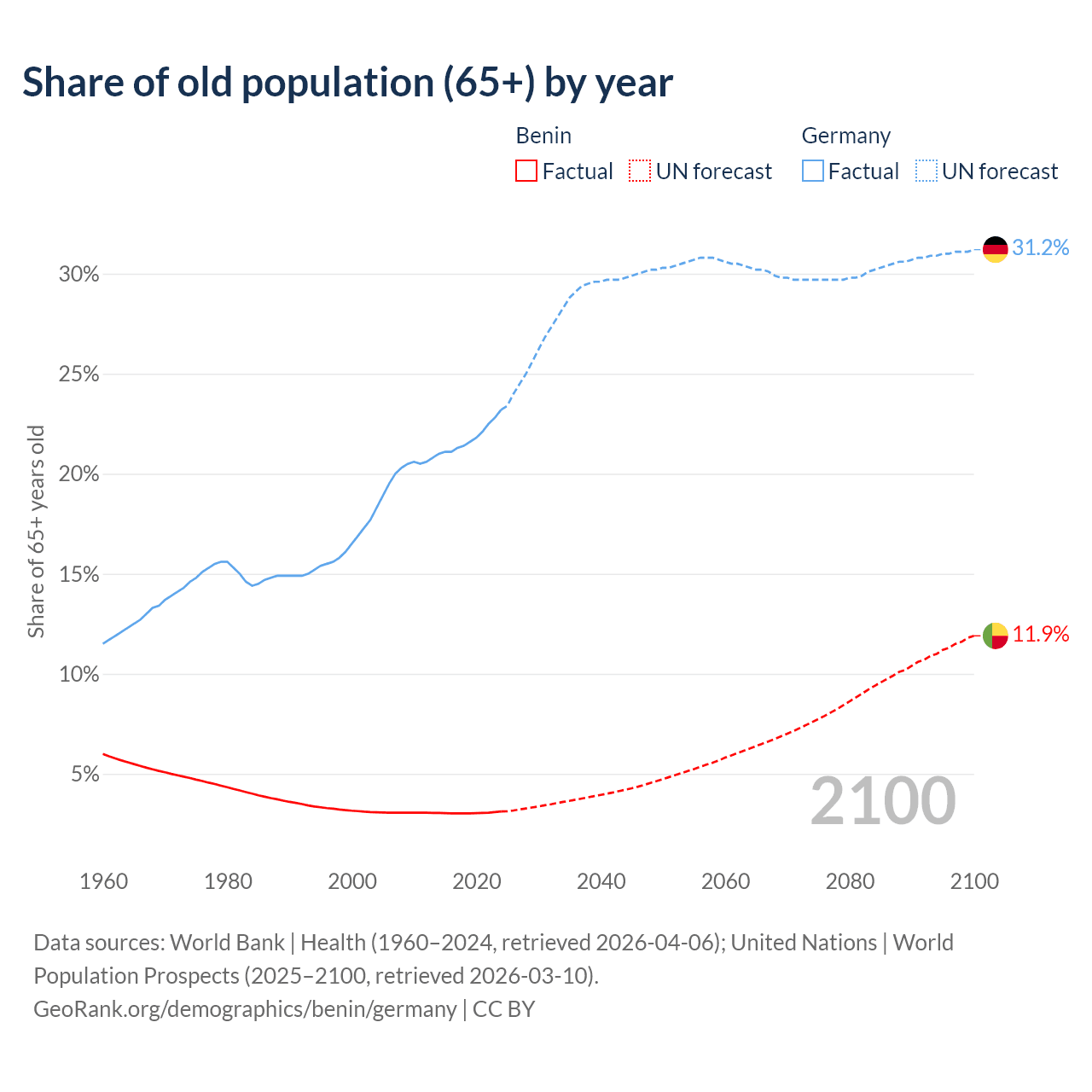 The share of older people aged 65 and over is 3.12% in Benin and 23.2% in Germany. Life expectancy in Benin compared to Germany .