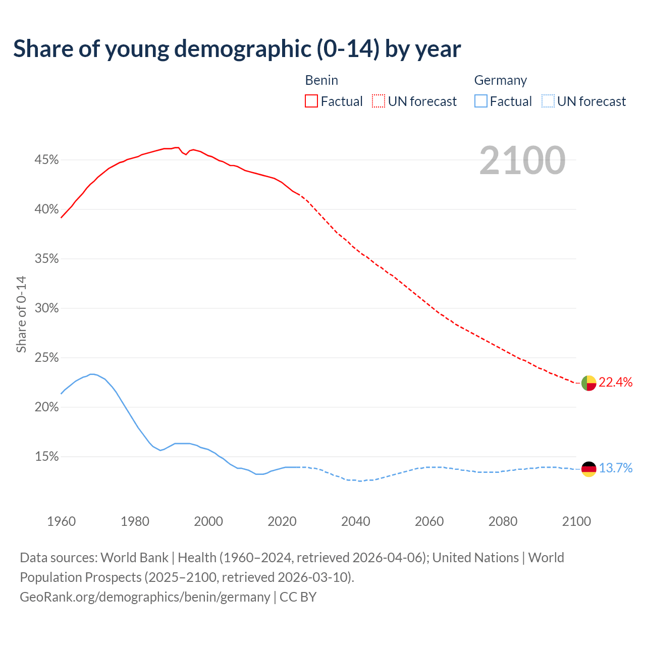 - The share of young demographic (0-15 years old) in Benin is 41.6% vs 13.9% in Germany.