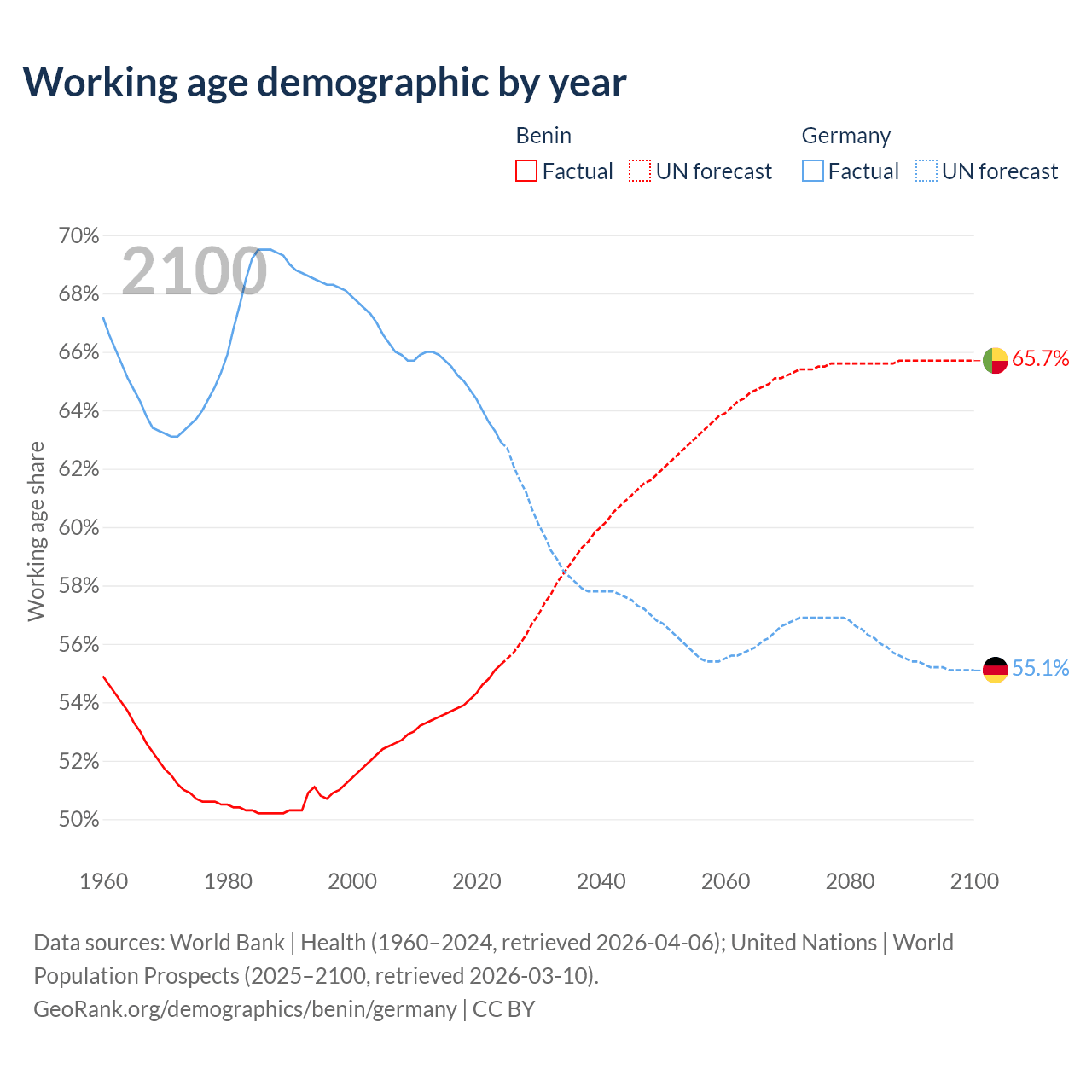 Median age Benin vs Germany, 1960-2100