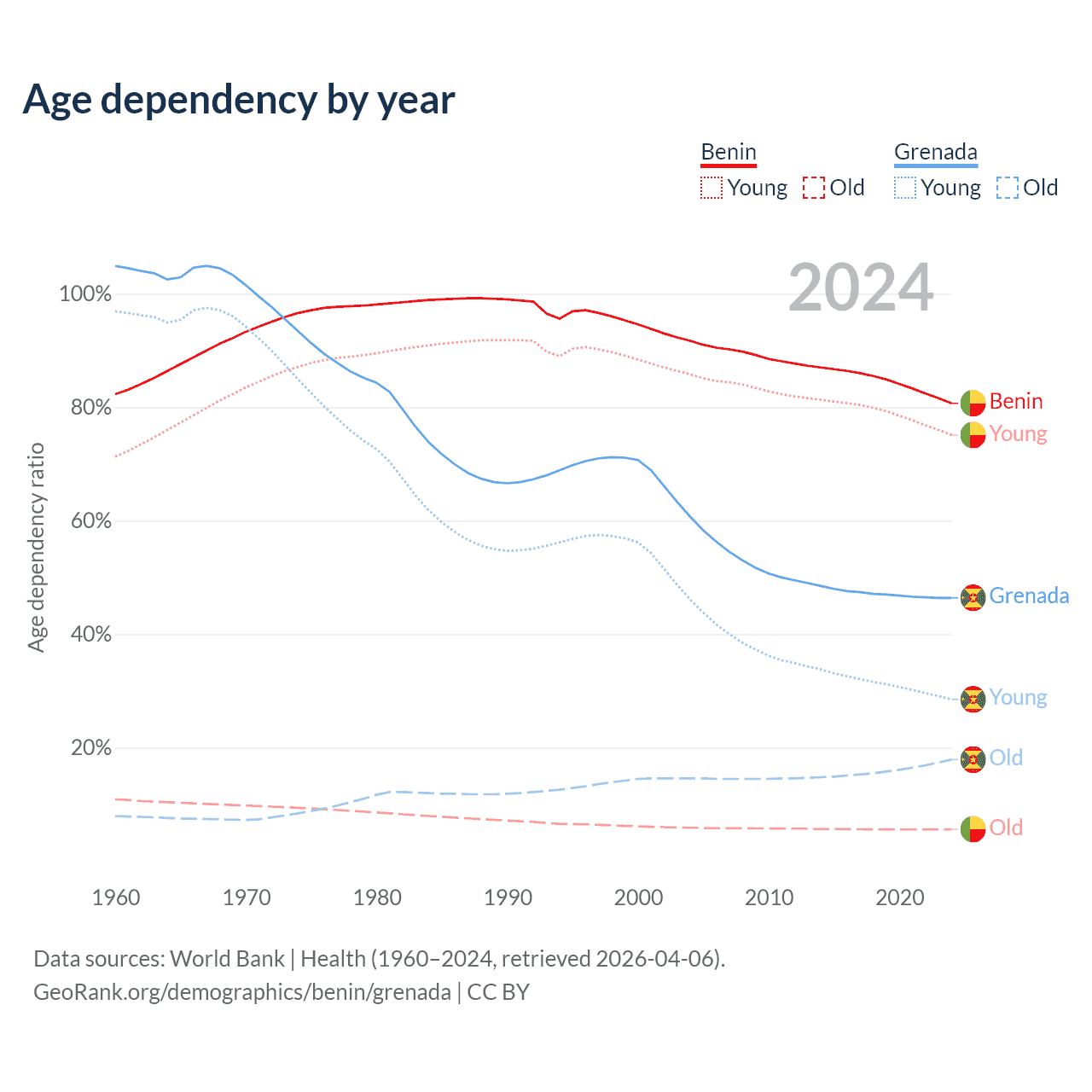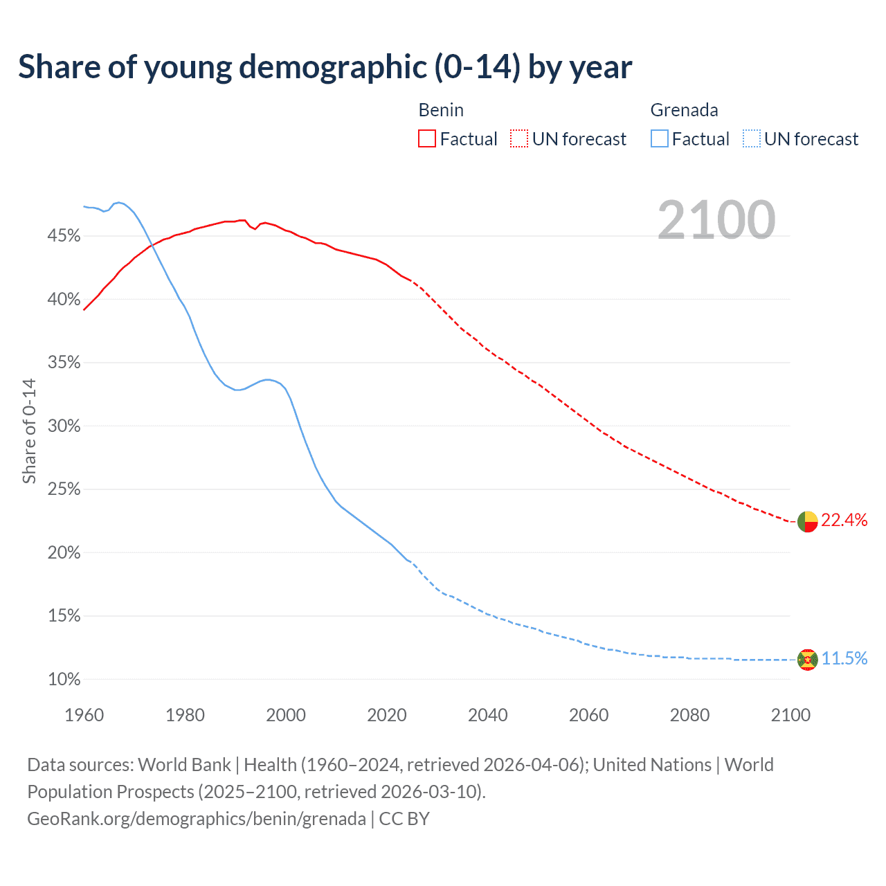 - The share of young demographic (0-15 years old) in Benin is 41.6% vs 19.4% in Grenada.