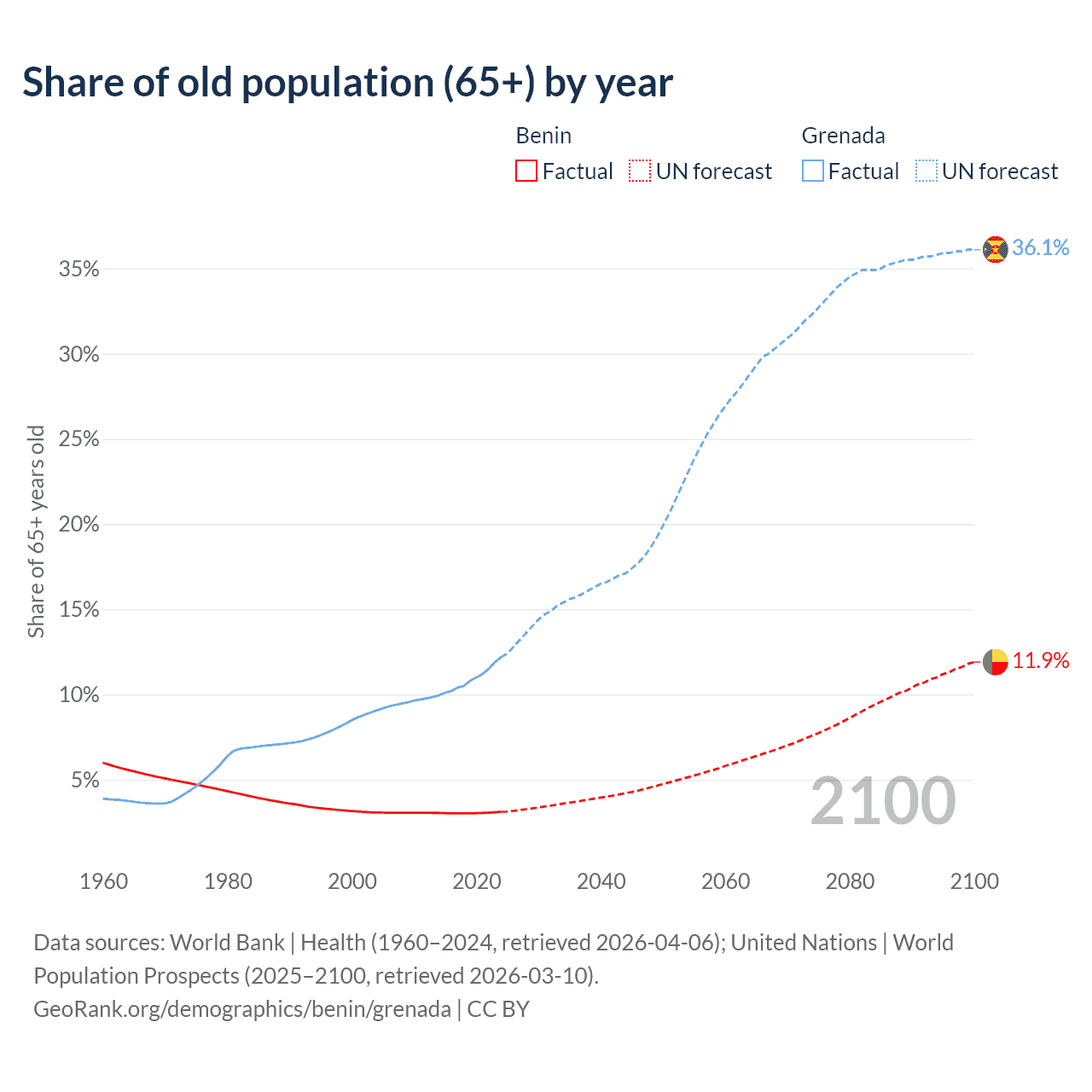 - The share of old-age demographic (65+) in Benin is 3.12% vs 12.2% in Grenada.