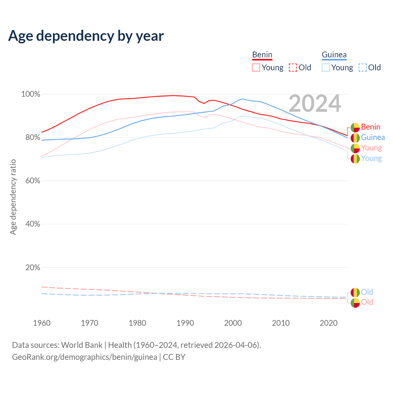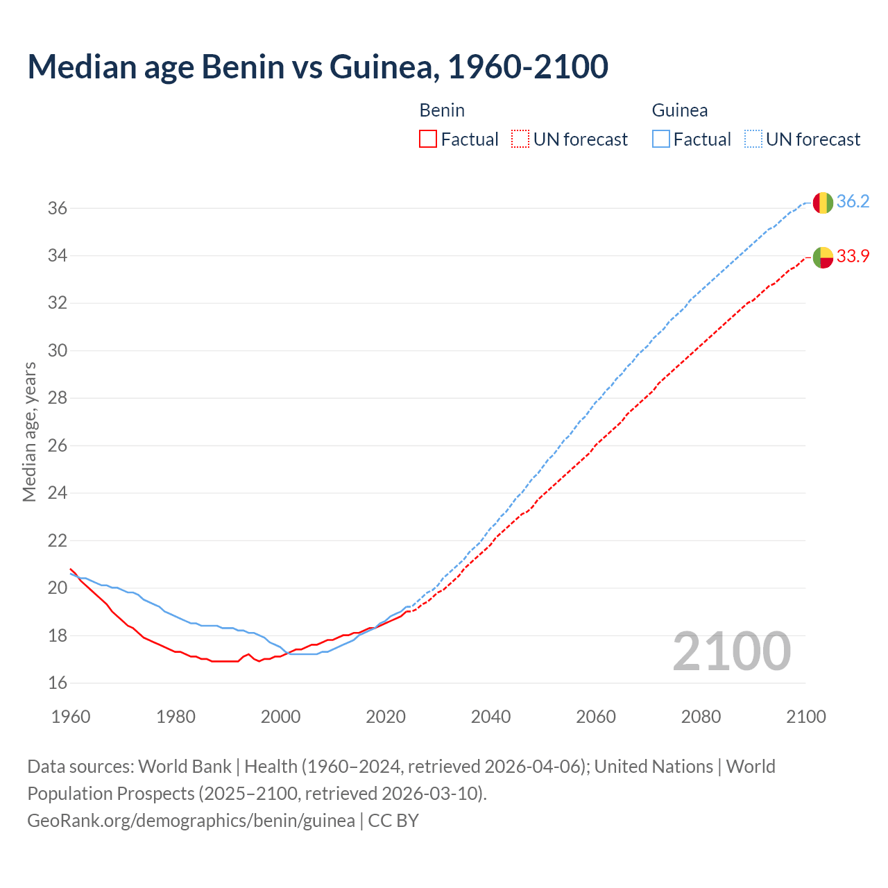 - Benin is ranked 179/196 by median age (oldest to youngest) vs 176/196 for Guinea.
