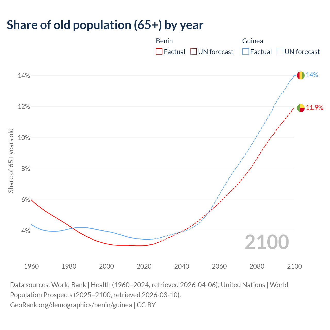 - The share of old-age demographic (65+) in Benin is 3.12% vs 3.46% in Guinea.