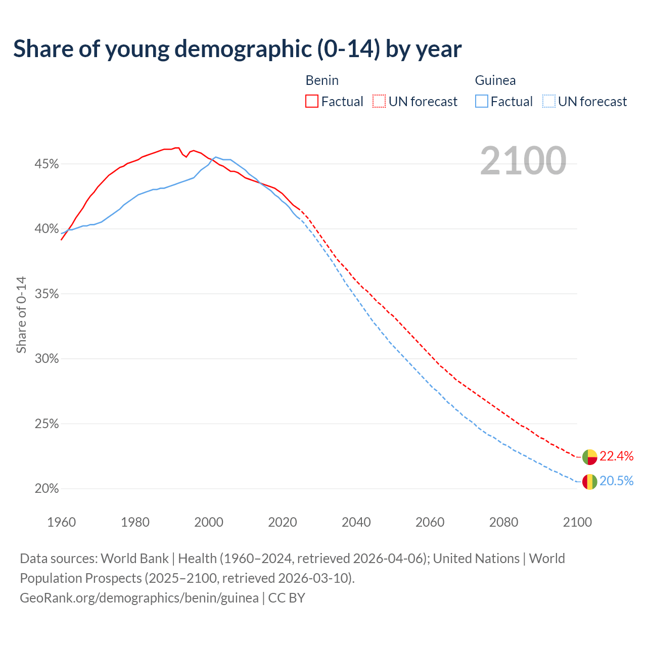 - As of 2026, the population of Benin is 15.3M vs 15.5M in Guinea.