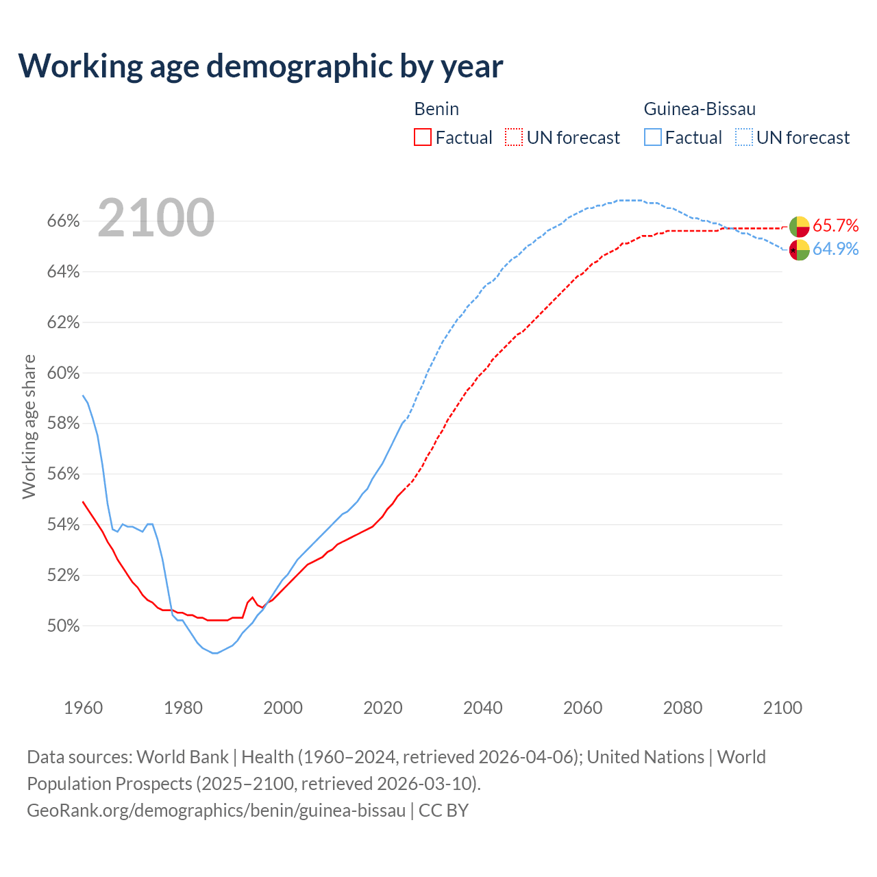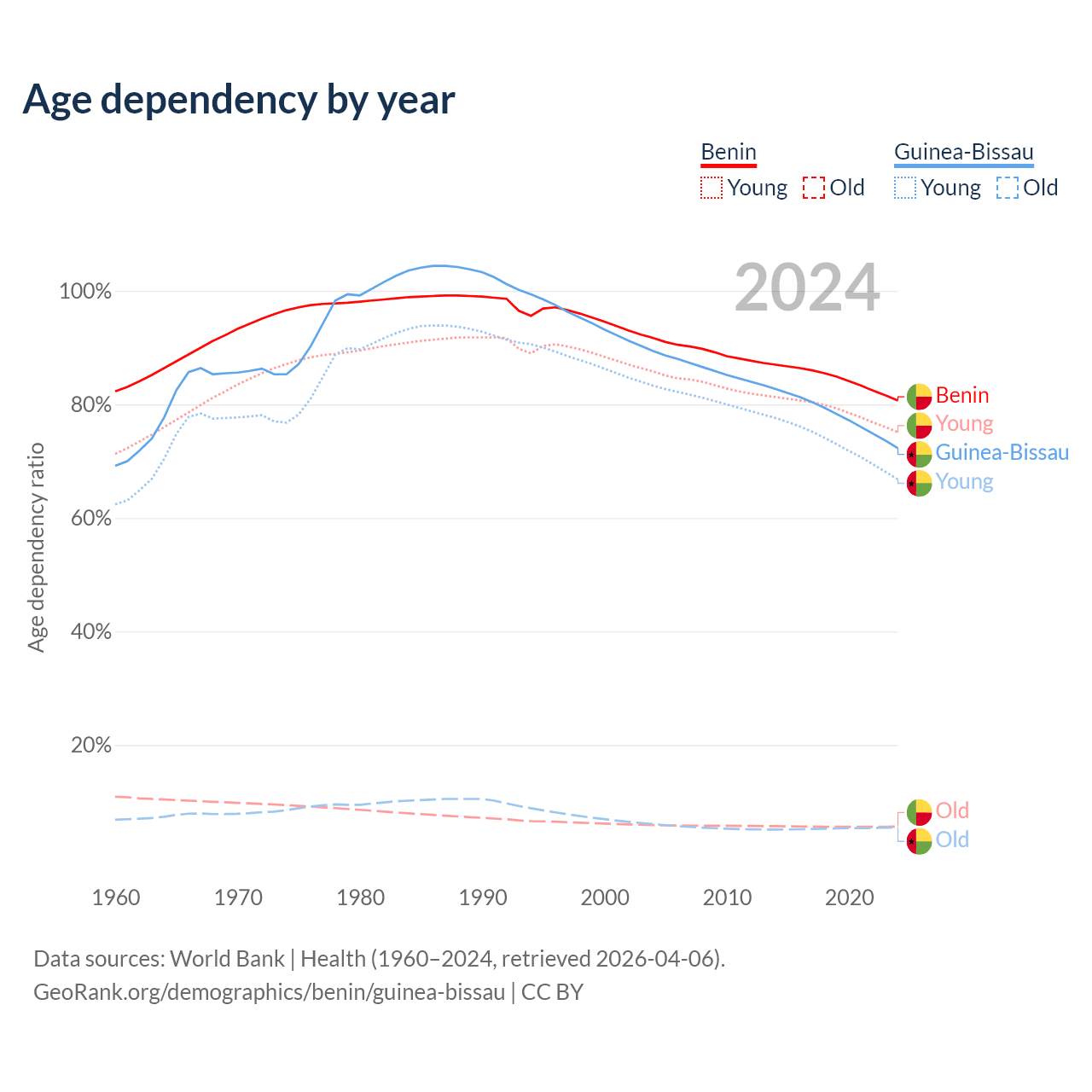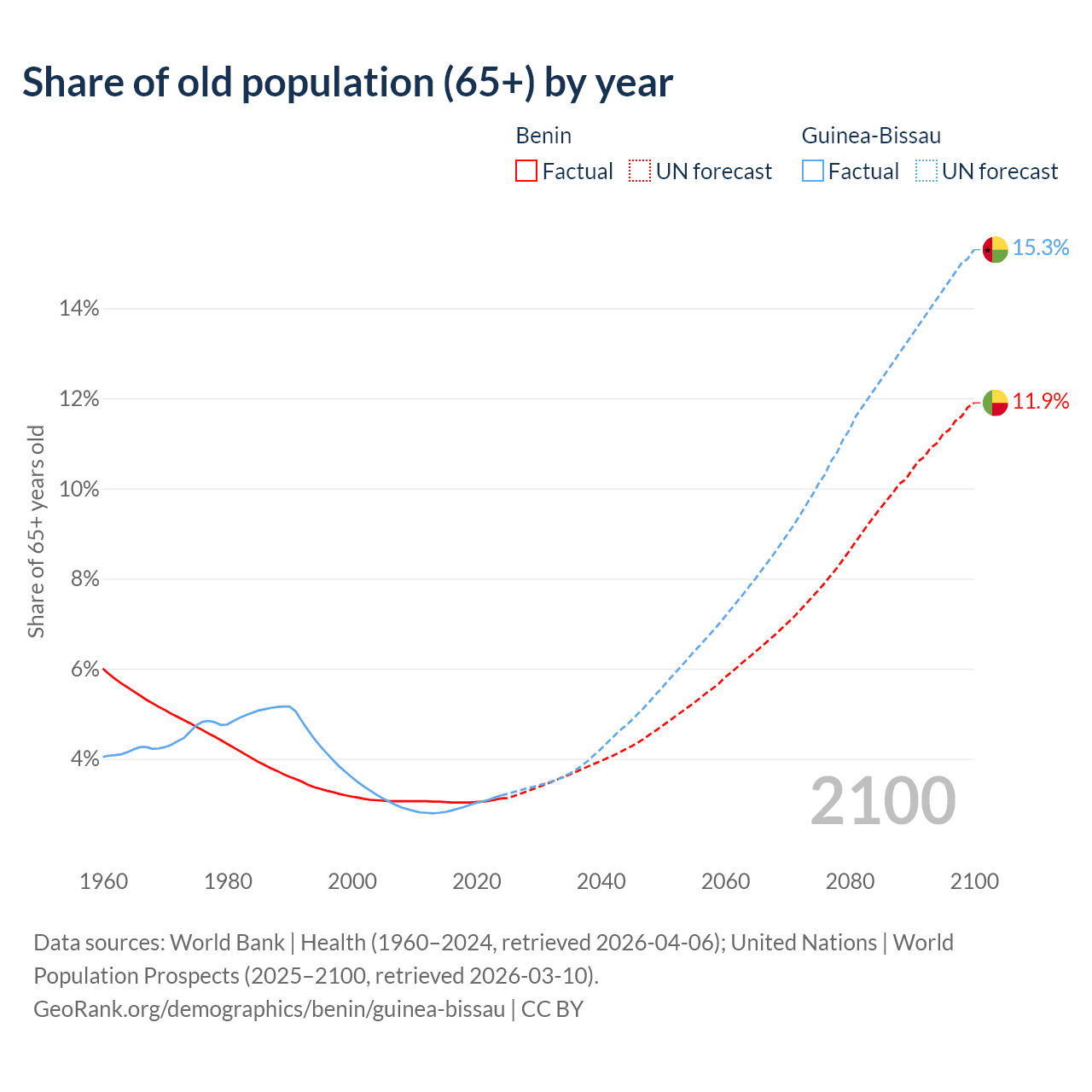 - The share of old-age demographic (65+) in Benin is 3.12% vs 3.19% in Guinea-Bissau.