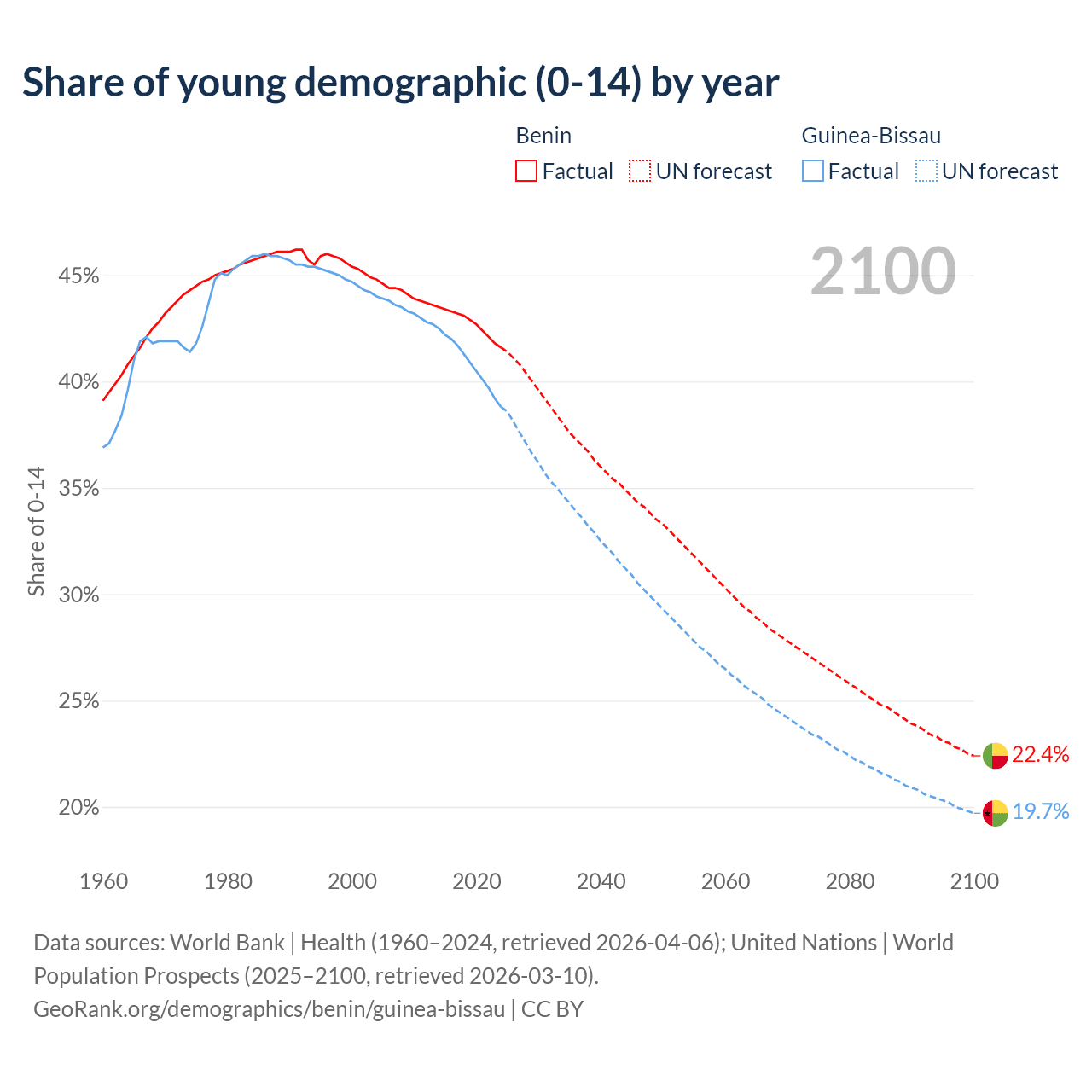 - The share of young demographic (0-15 years old) in Benin is 41.6% vs 38.8% in Guinea-Bissau.