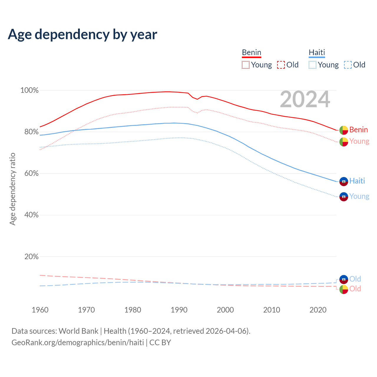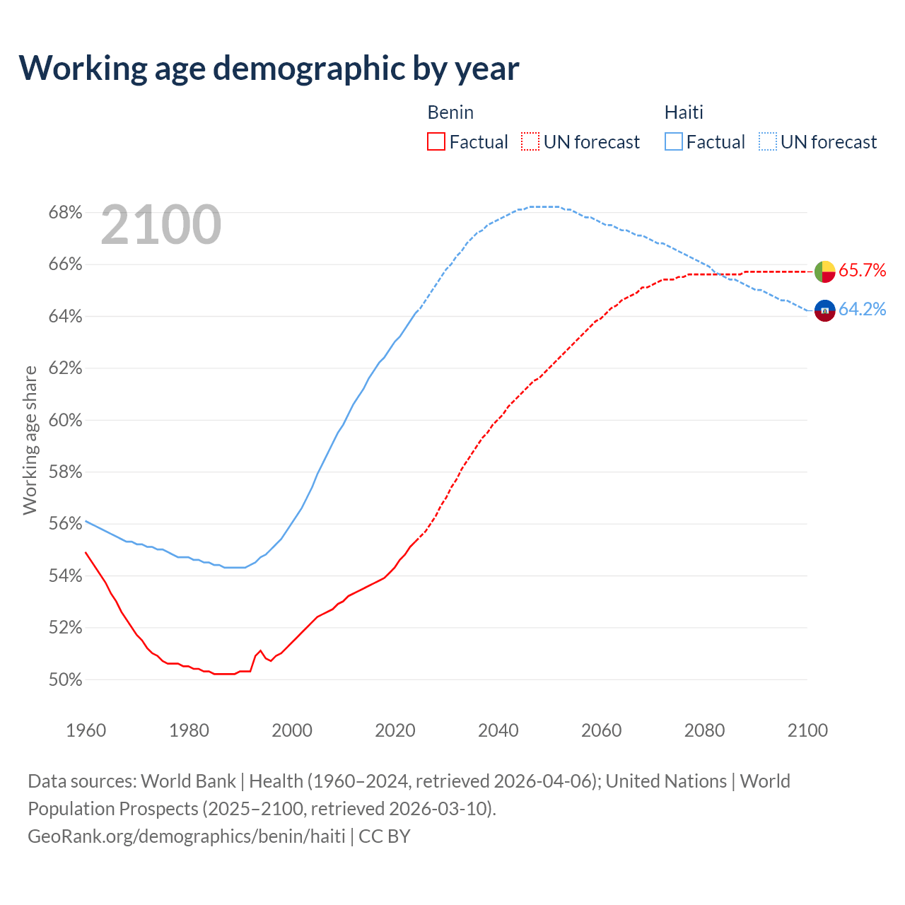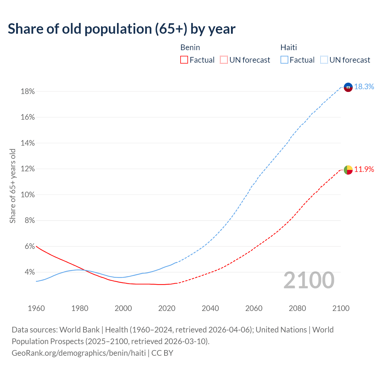 The share of older people aged 65 and over is 3.12% in Benin and 4.71% in Haiti. Life expectancy in Benin compared to Haiti .