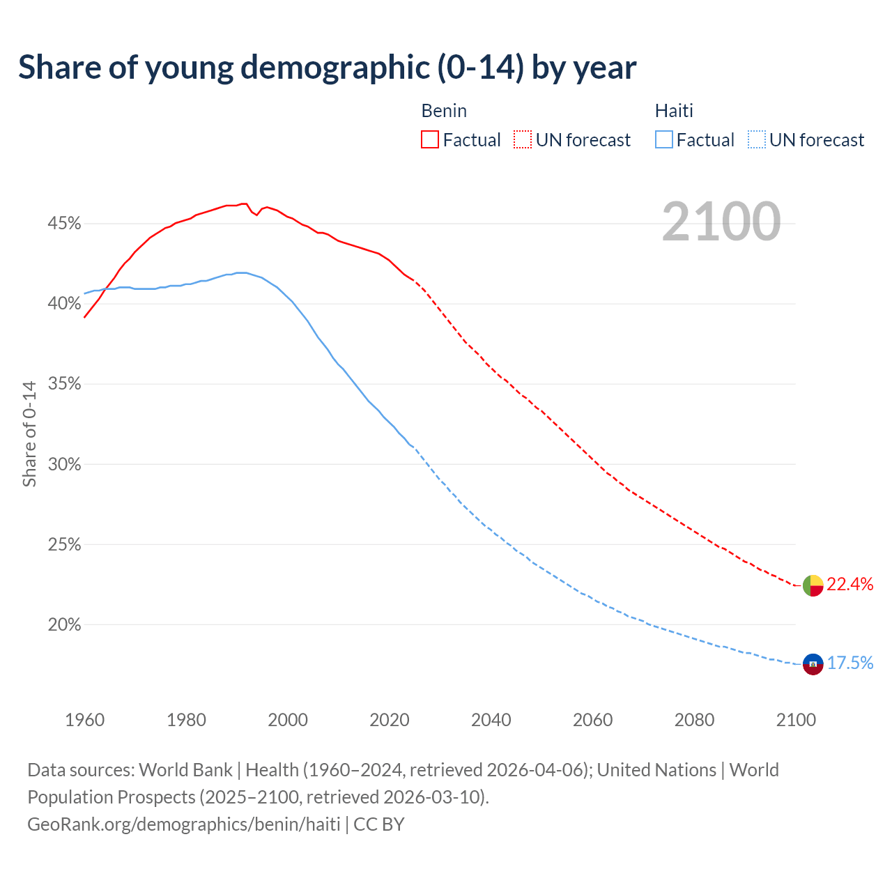 Median age Benin vs Haiti, 1960-2100