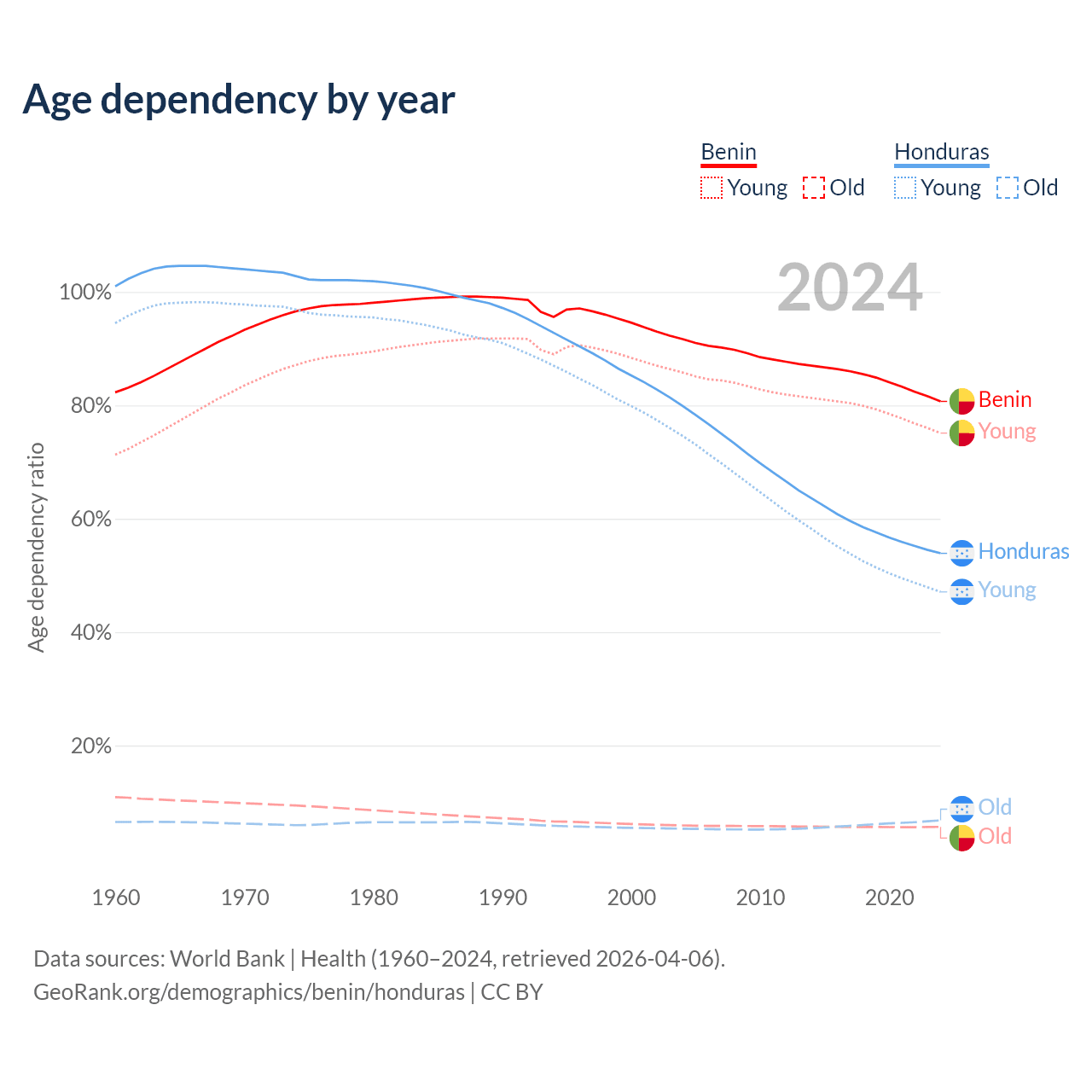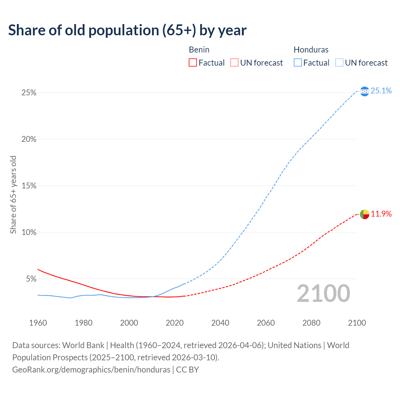 - The share of old-age demographic (65+) in Benin is 3.12% vs 4.42% in Honduras.