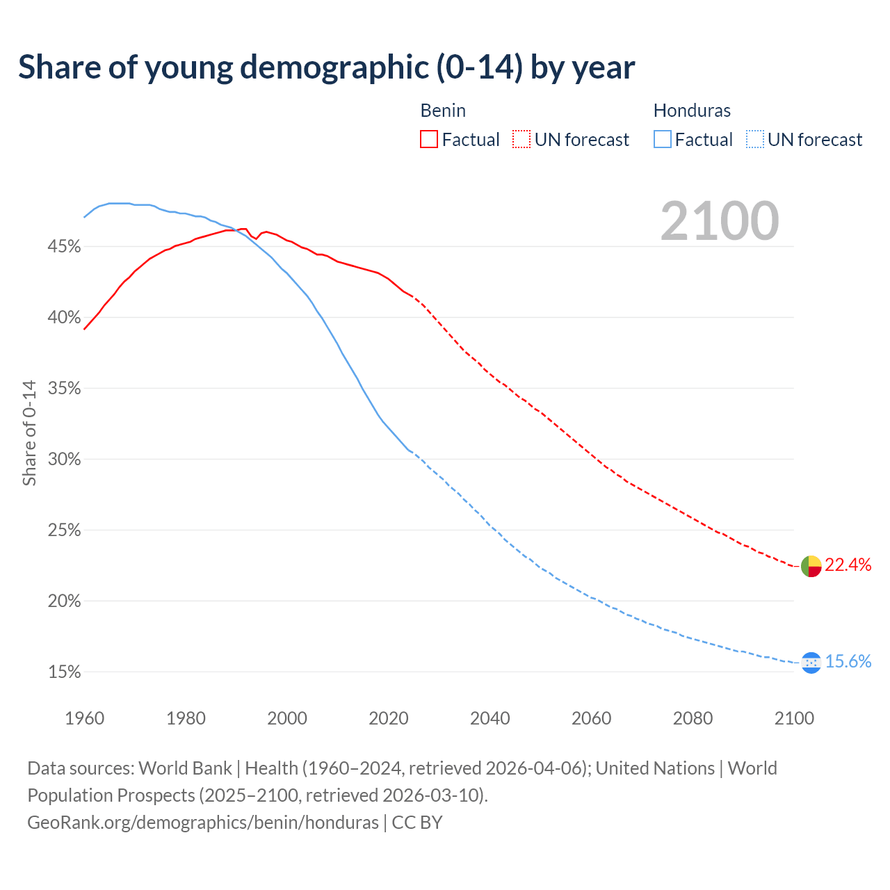 - The share of young demographic (0-15 years old) in Benin is 41.6% vs 30.6% in Honduras.
