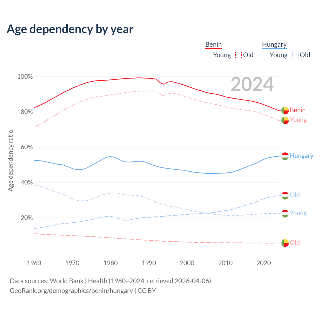 - The share of old-age demographic (65+) in Benin is 3.12% vs 21% in Hungary.