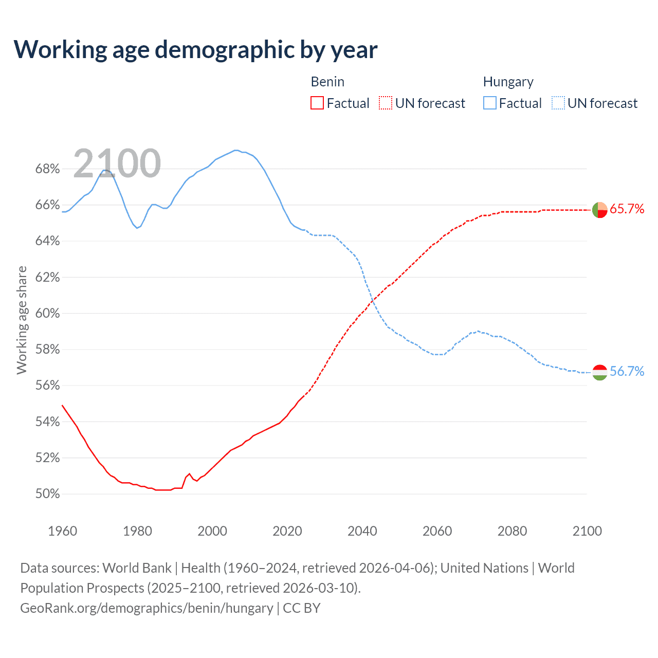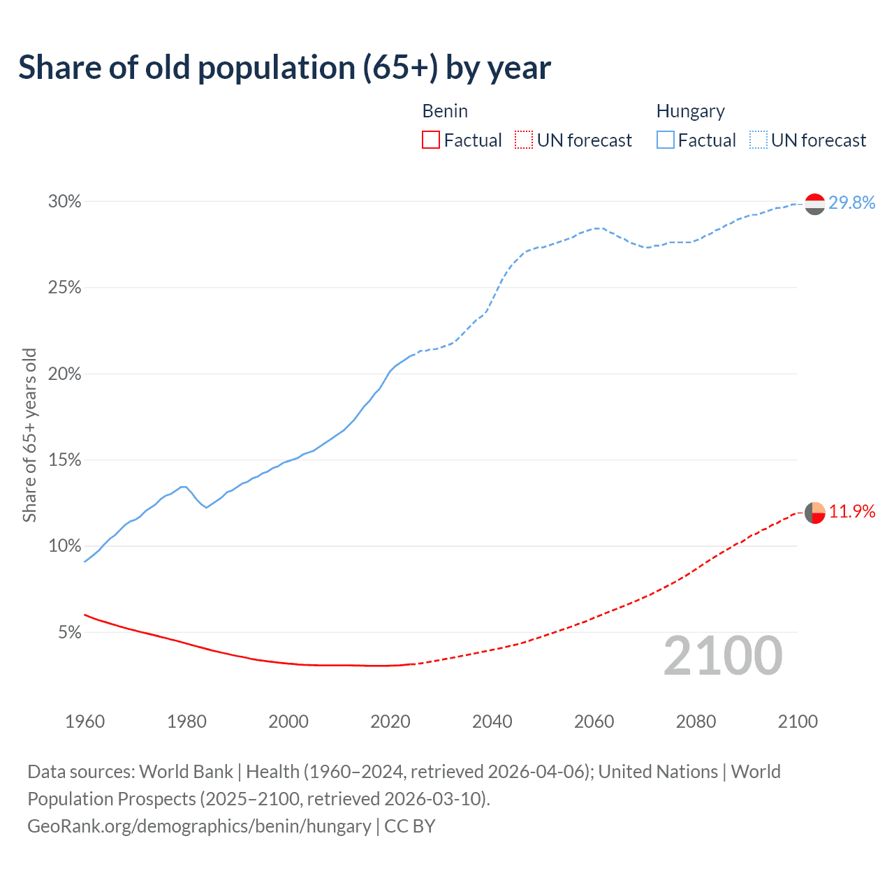 The share of older people aged 65 and over is 3.12% in Benin and 21% in Hungary. Life expectancy in Benin compared to Hungary .