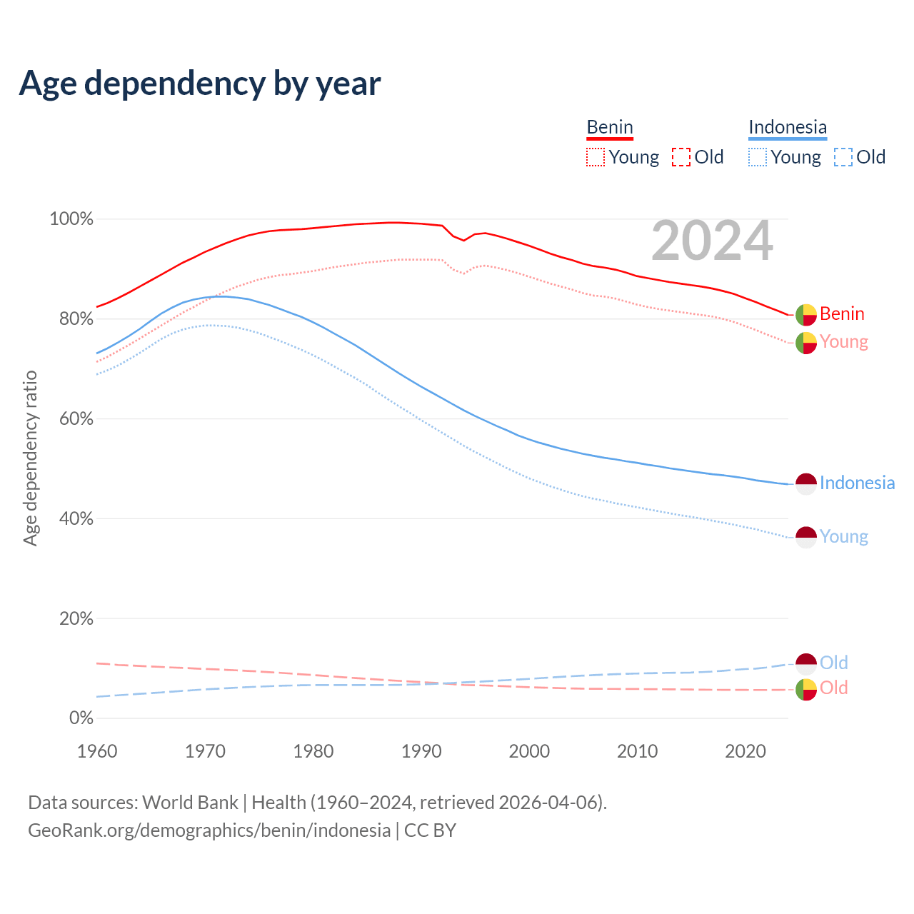 - Benin is ranked 179/196 by median age (oldest to youngest) vs 93/196 for Indonesia.