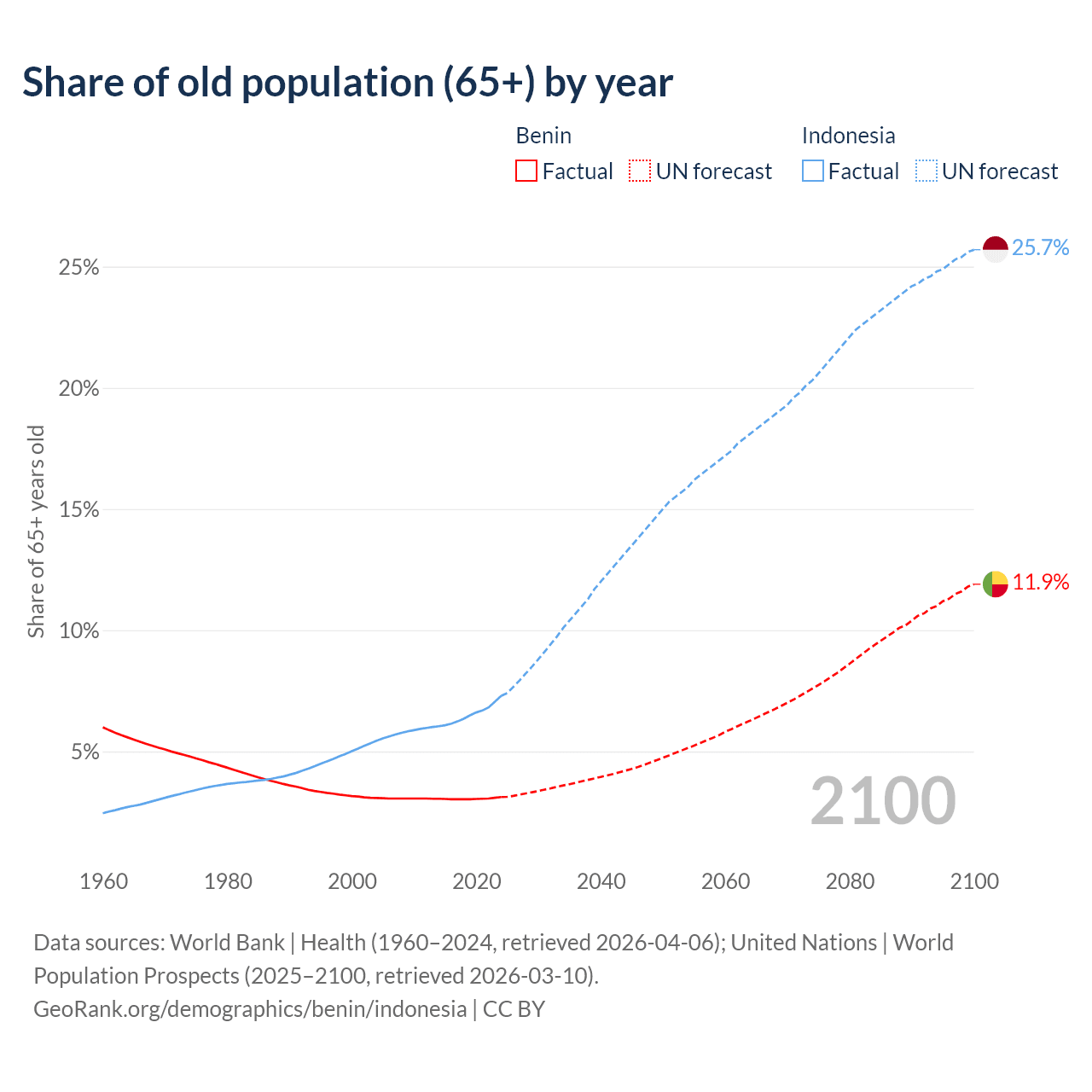 The share of older people aged 65 and over is 3.12% in Benin and 7.29% in Indonesia. Life expectancy in Benin compared to Indonesia .