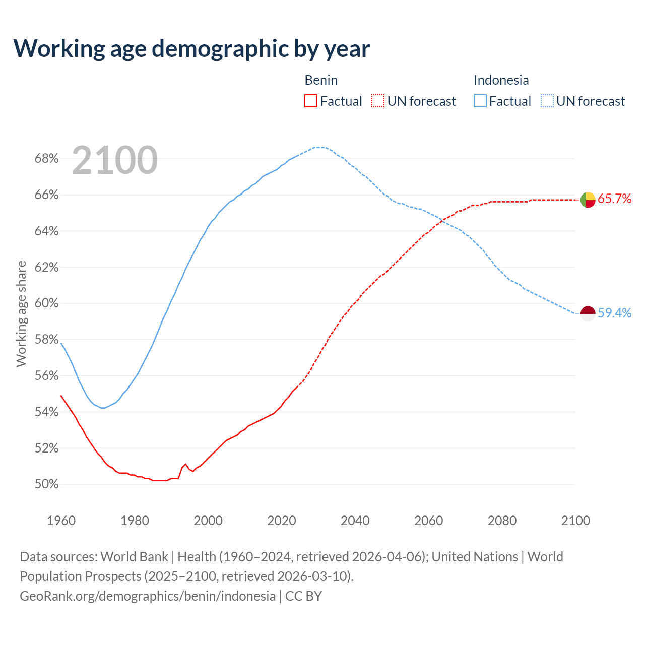 Median age Benin vs Indonesia, 1960-2100