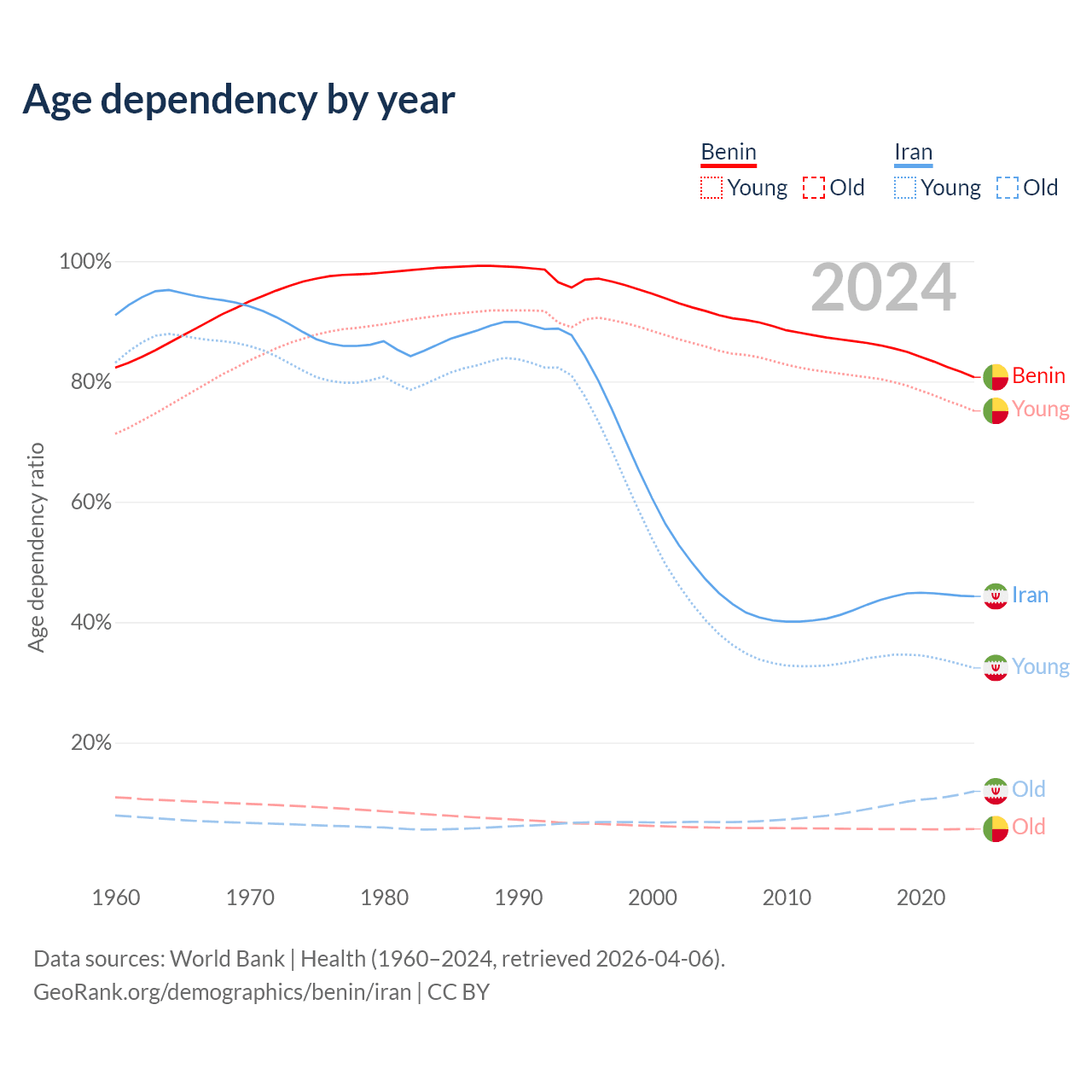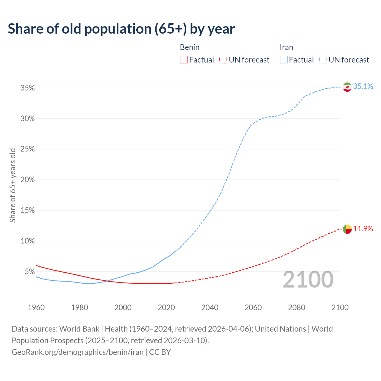 - The share of old-age demographic (65+) in Benin is 3.12% vs 8.24% in Iran.