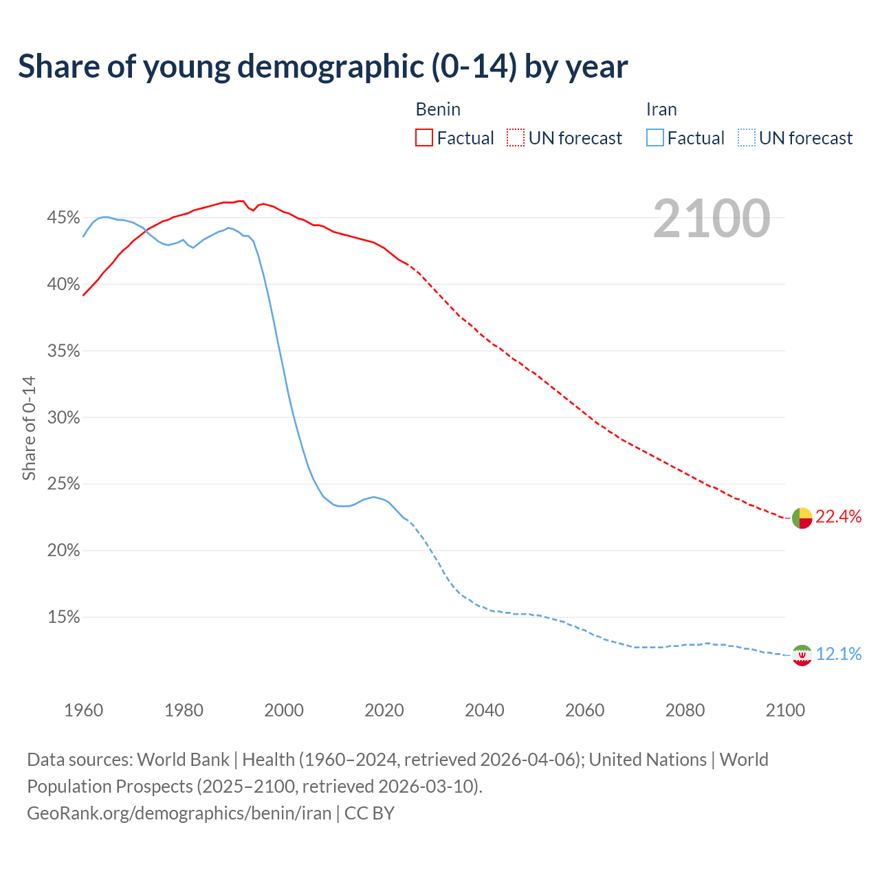 - The share of young demographic (0-15 years old) in Benin is 41.6% vs 22.4% in Iran.