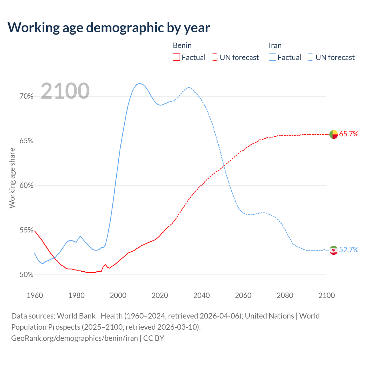 - Benin has 8.45M working age adults (aged 15-64) vs 64.8M in Iran.