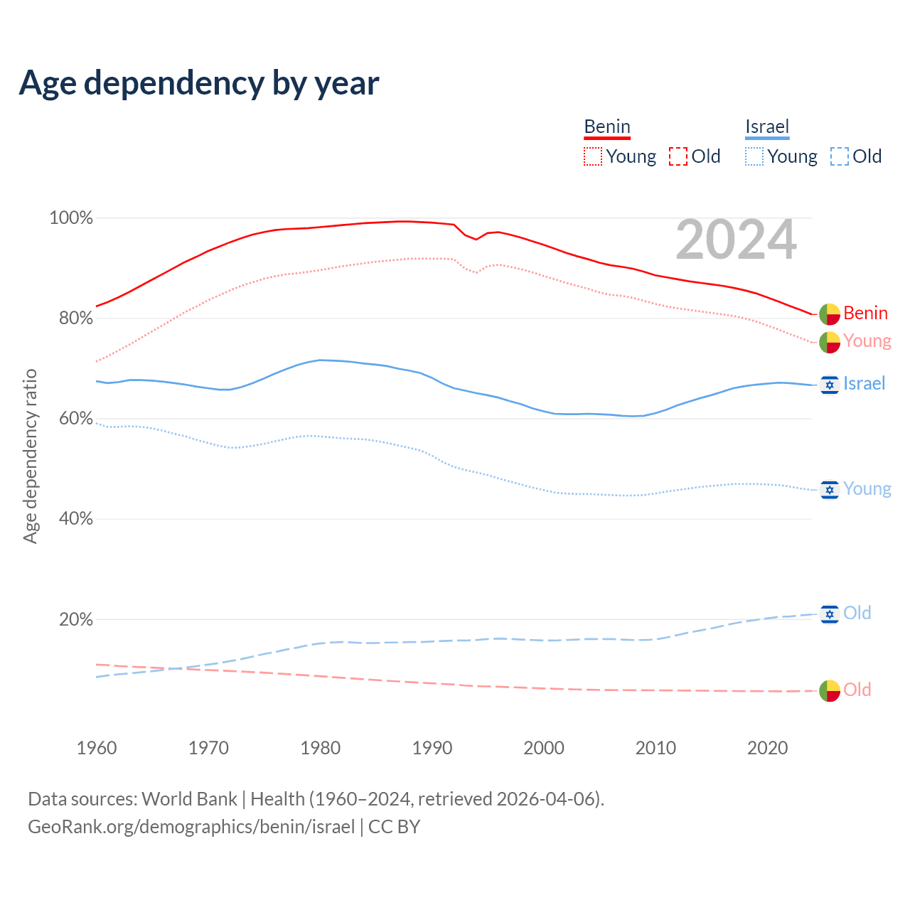 - Benin is ranked 179/196 by median age (oldest to youngest) vs 103/196 for Israel.
