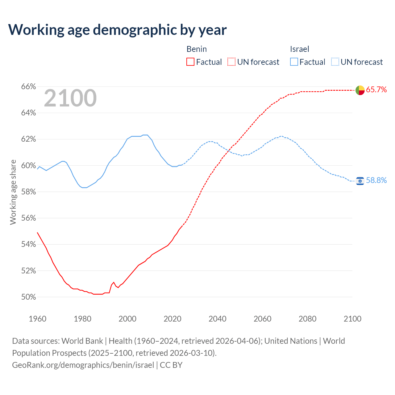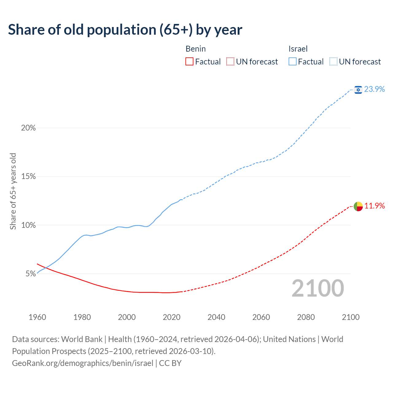 The share of older people aged 65 and over is 3.12% in Benin and 12.6% in Israel. Life expectancy in Benin compared to Israel .
