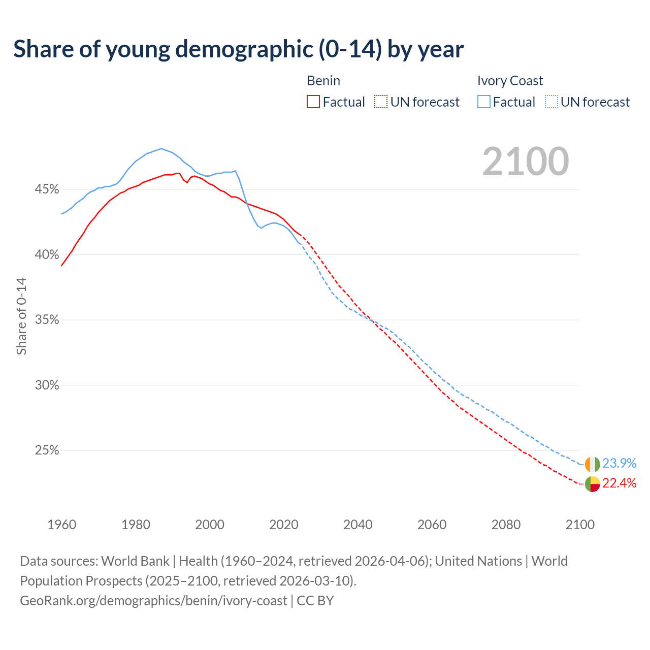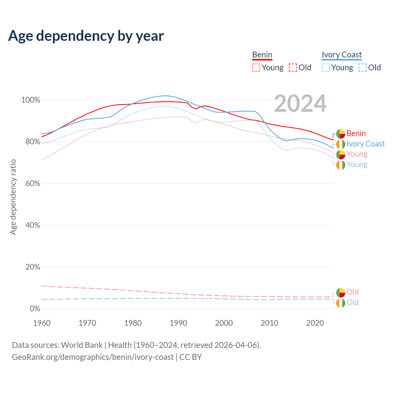 - Benin is ranked 179/196 by median age (oldest to youngest) vs 175/196 for Ivory Coast.