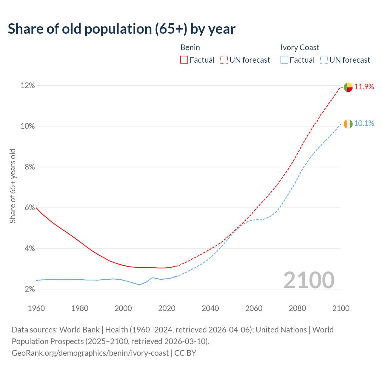 - The share of old-age demographic (65+) in Benin is 3.12% vs 2.61% in Ivory Coast.