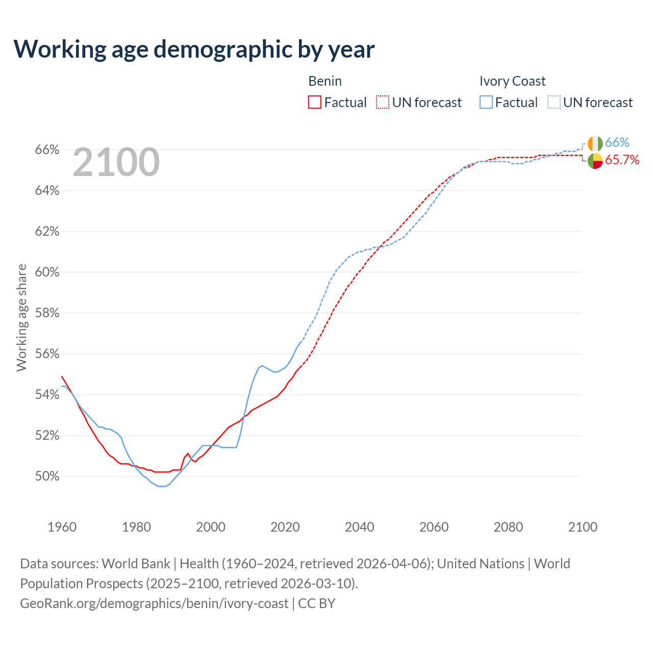 - Benin has 8.45M working age adults (aged 15-64) vs 19.1M in Ivory Coast.