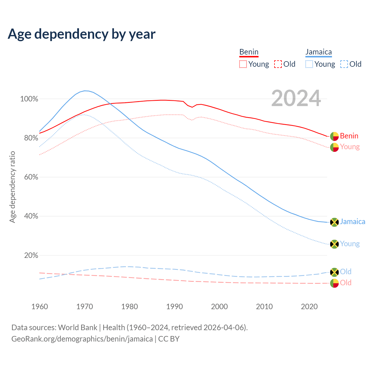 - The share of old-age demographic (65+) in Benin is 3.12% vs 8.21% in Jamaica.