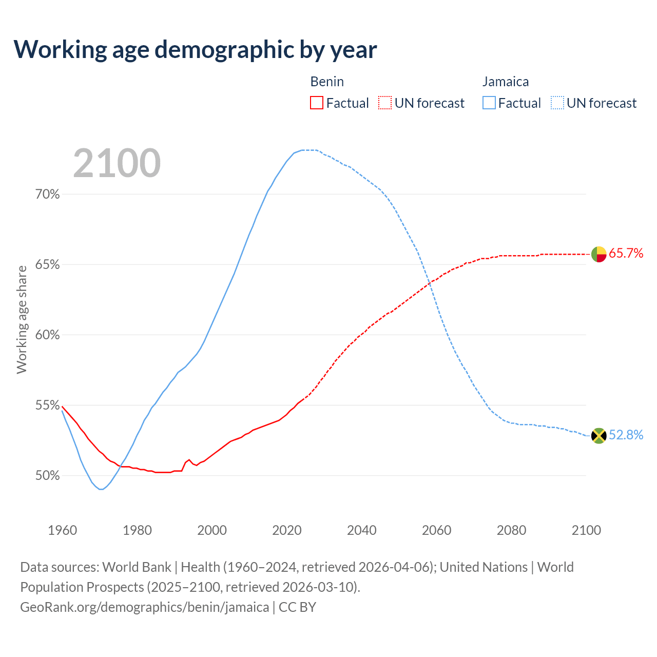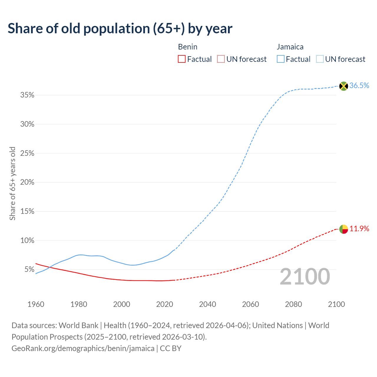 The share of older people aged 65 and over is 3.12% in Benin and 8.21% in Jamaica. Life expectancy in Benin compared to Jamaica .