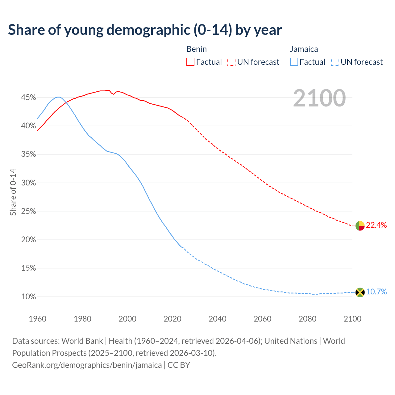 - The share of young demographic (0-15 years old) in Benin is 41.6% vs 18.7% in Jamaica.