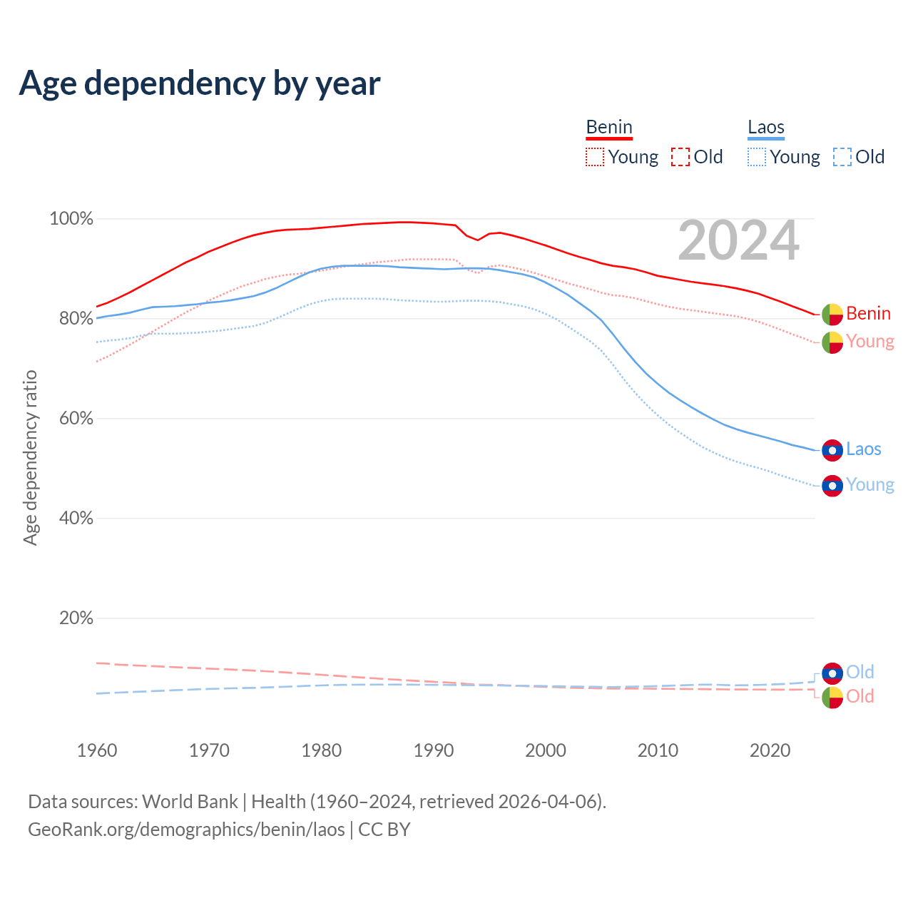 - Benin is ranked 179/196 by median age (oldest to youngest) vs 130/196 for Laos.