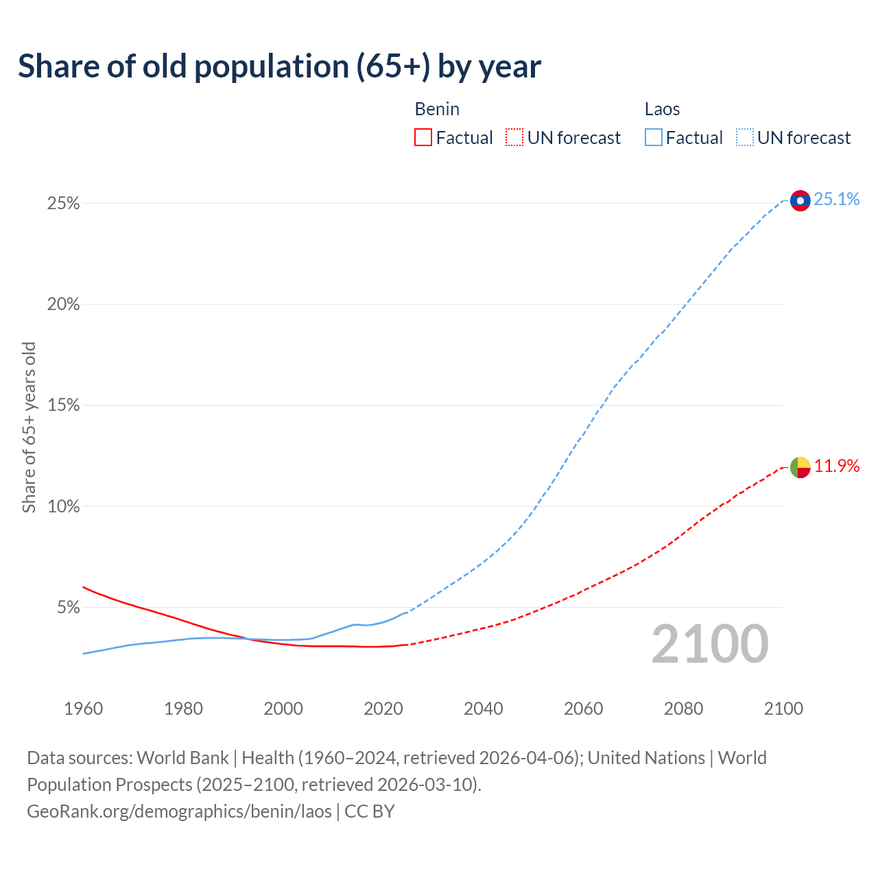 - The share of old-age demographic (65+) in Benin is 3.12% vs 4.67% in Laos.