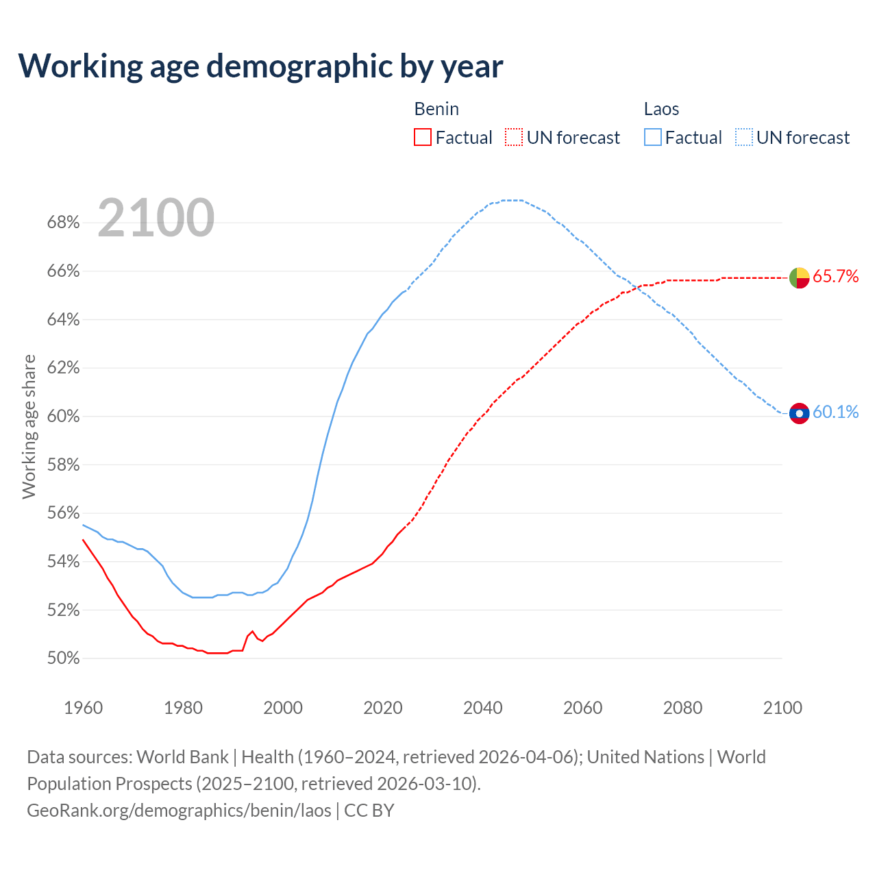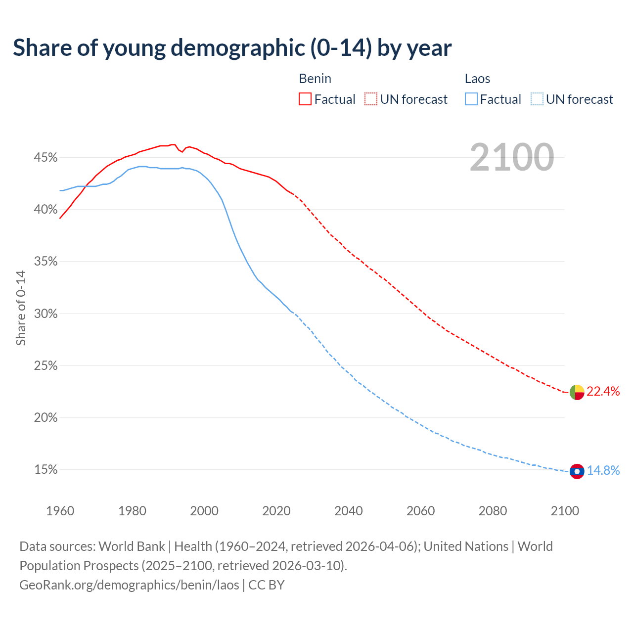 - The share of young demographic (0-15 years old) in Benin is 41.6% vs 30.2% in Laos.