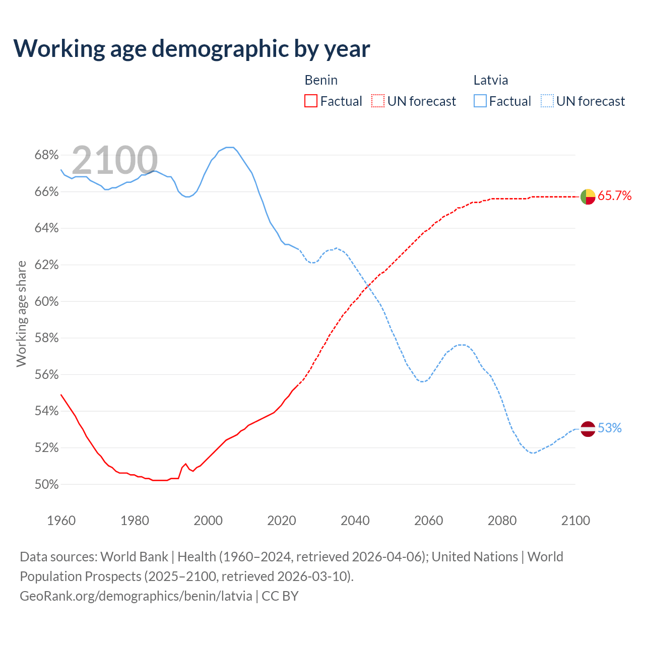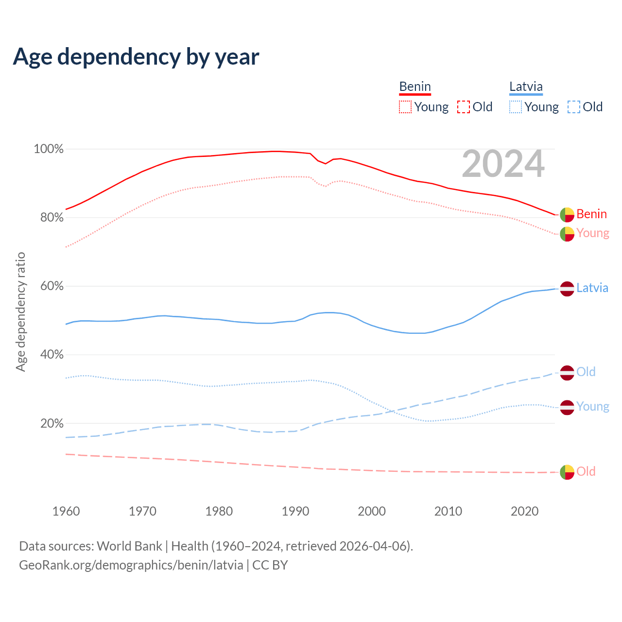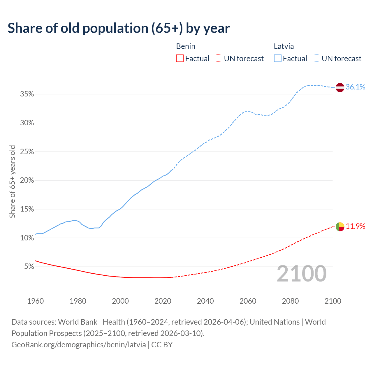 - The share of old-age demographic (65+) in Benin is 3.12% vs 21.7% in Latvia.
